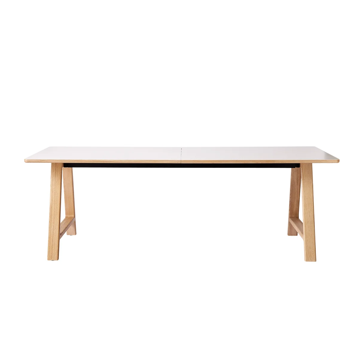 La table à rallonge rectangulaire, fabriquée dans des matériaux robustes, est robuste. T11 se distingue par sa résistance et sa solidité. Le plateau de table en stratifié Pfeiffer blanc résistant présente une surface lisse, complétée par un bord raffiné en chêne massif. Le piètement de la table, un classique en chêne pigmenté blanc, lui confère non seulement une certaine légèreté, mais aussi une chaleur naturelle.