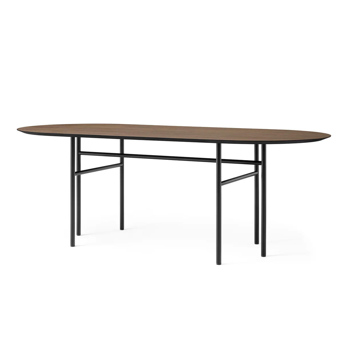 Disponible en différentes tailles et formes, cette table au design discret avec un placage en chêne teinté et un piètement revêtu par poudre est également disponible en version ronde ou rectangulaire.