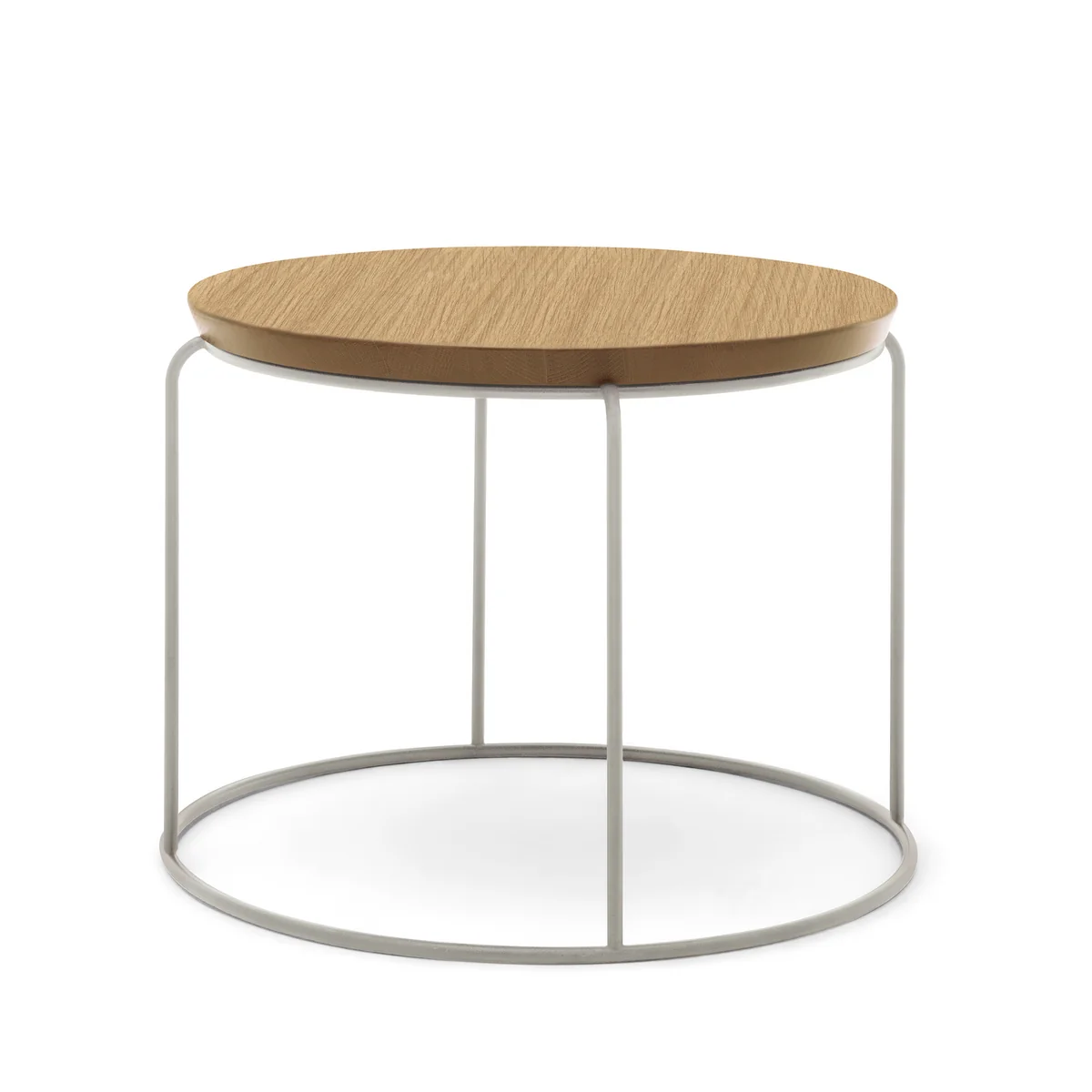 Le plateau en chêne est aussi disponible en différentes variantes alors que le piètement en acier courbé soudé est thermo-laqué et disponible en différentes couleurs RAL. Il existe également un plateau rectangulaire et plusieurs hauteurs de la table basse 151.