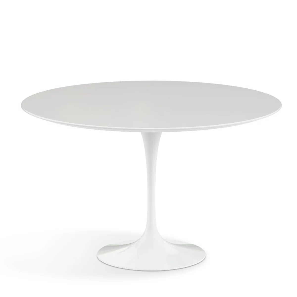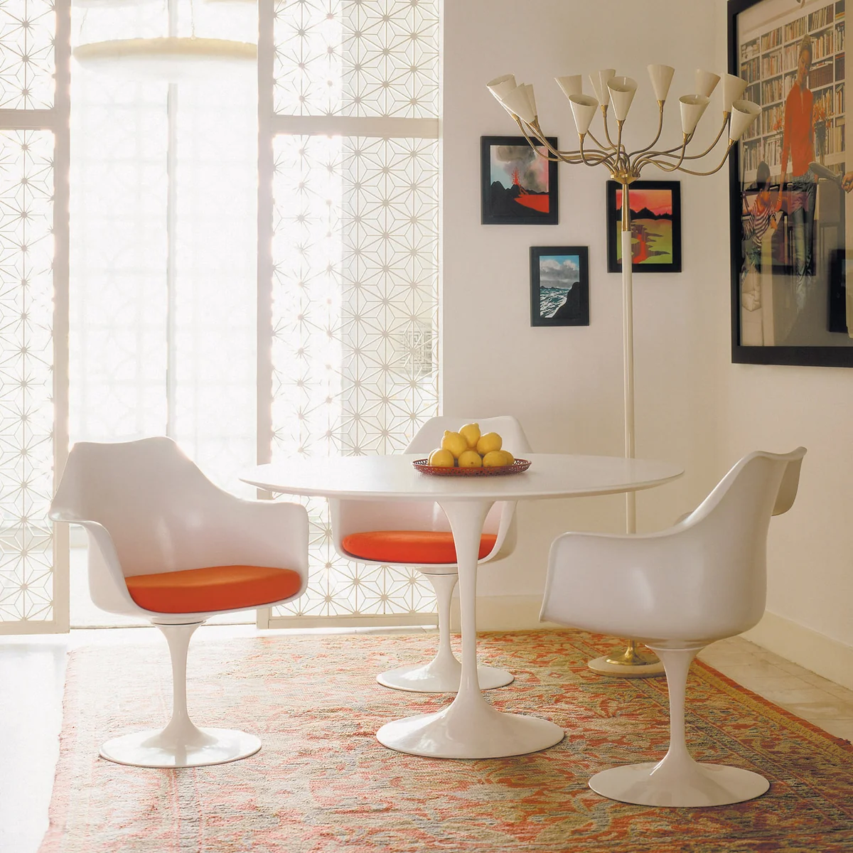 Knoll fabrique la table Saarinen Tulip avec un piétement en aluminium moulé avec revêtement Rilsan. Le plateau de table est en stratifié, disponible en différents placages de bois et en diverses variantes de marbre.
