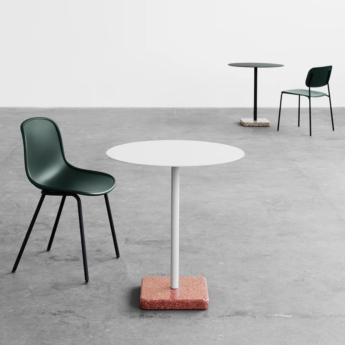 Alors que le plateau de la table ronde est en acier durable, recouvert de poudre, la base est en acier solide Terrazzo . Malgré ses propriétés robustes, il semble coloré et quelque peu ludique, créant une rupture stylistique intentionnelle entre le haut et le bas. Bien que Terrazzo ait des propriétés similaires à celles du béton, le premier matériau a une surface beaucoup plus impressionnante qui ne passe pas inaperçue.