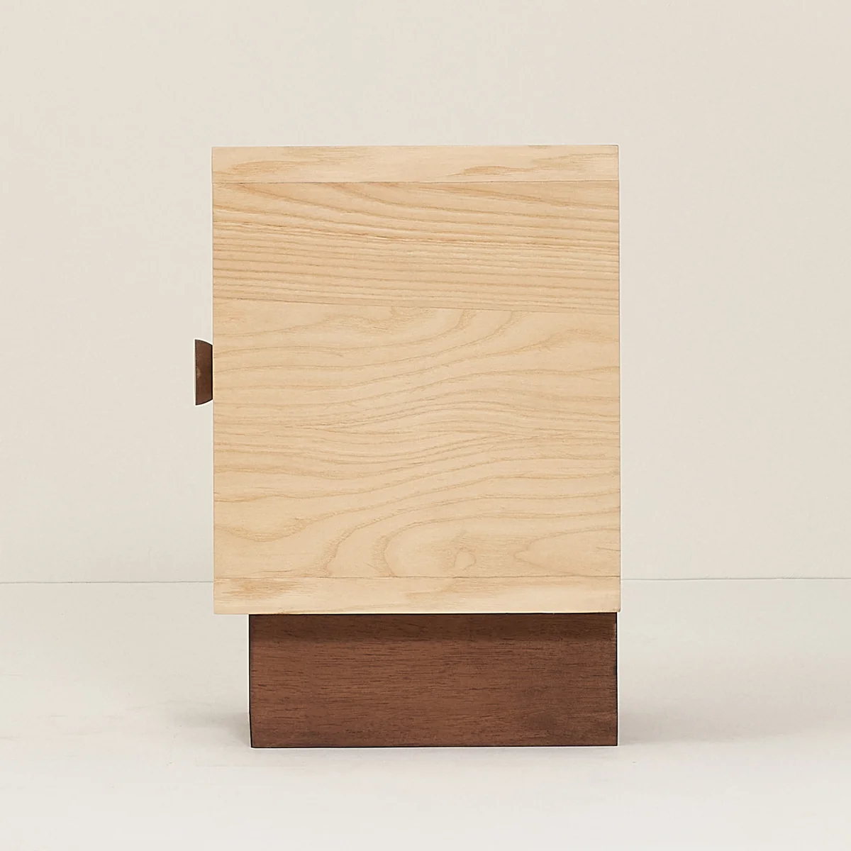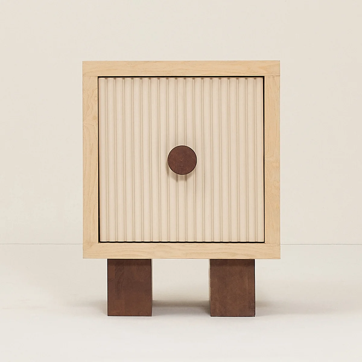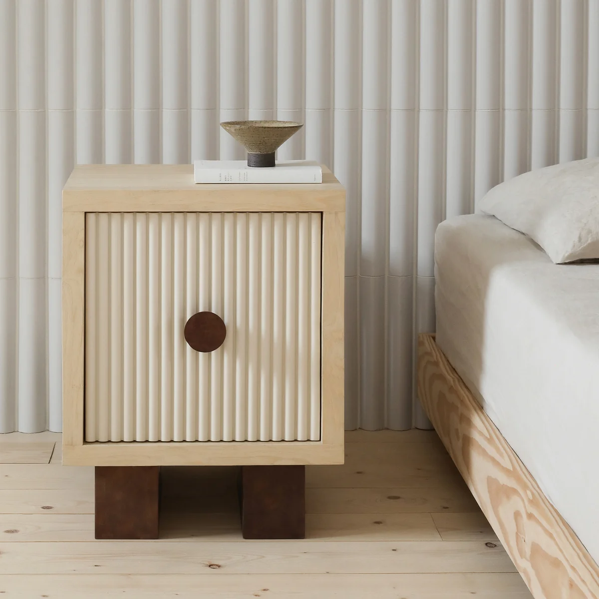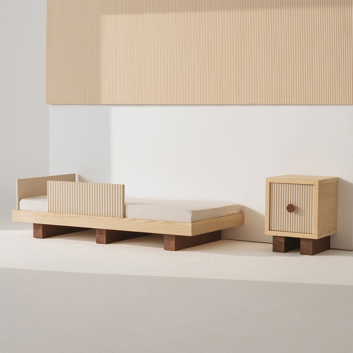 La surface rainurée de la porte invite les enfants à découvrir les textures de manière ludique, tandis que la poignée arrondie et contrastée est non seulement facile à saisir, mais aussi conçue de manière sûre et adaptée aux enfants. Les pieds de la table de nuit, inspirés des sandales japonaises traditionnelles Geta, confèrent au meuble un caractère léger et flottant.