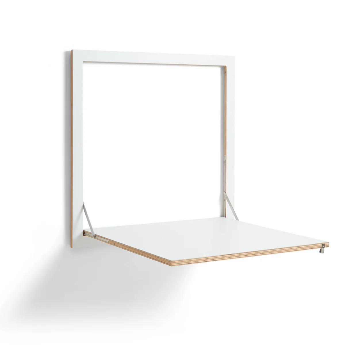 La table pliante est fabriquée en bouleau multiplex avec des charnières en acier inoxydable. Peinte à la main, elle est disponible en différentes couleurs. Une petite boucle en feutre facilite le dépliage du plateau. Une fois repliée, la table murale extra-plate convainc par sa profondeur d'à peine 3 cm, ce qui la rend absolument peu encombrante.