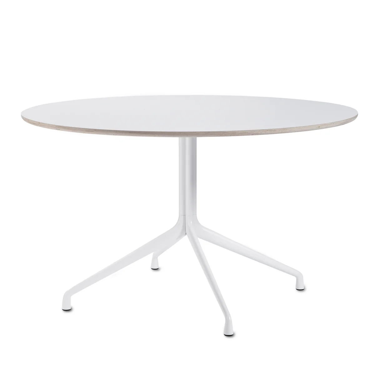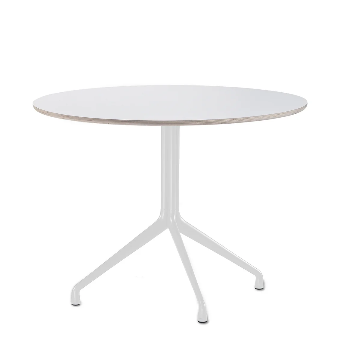 HAY produit la About A Table manger About A Table AAT 20 avec une base en aluminium enduit de poudre. Le plateau de table de 23 mm d'épaisseur est en contreplaqué, éventuellement recouvert de stratifié ou de linoléum. La version en stratifié blanc du plateau de table a un bord en bois brut, tandis que la version en linoléum noir a également un bord noir.