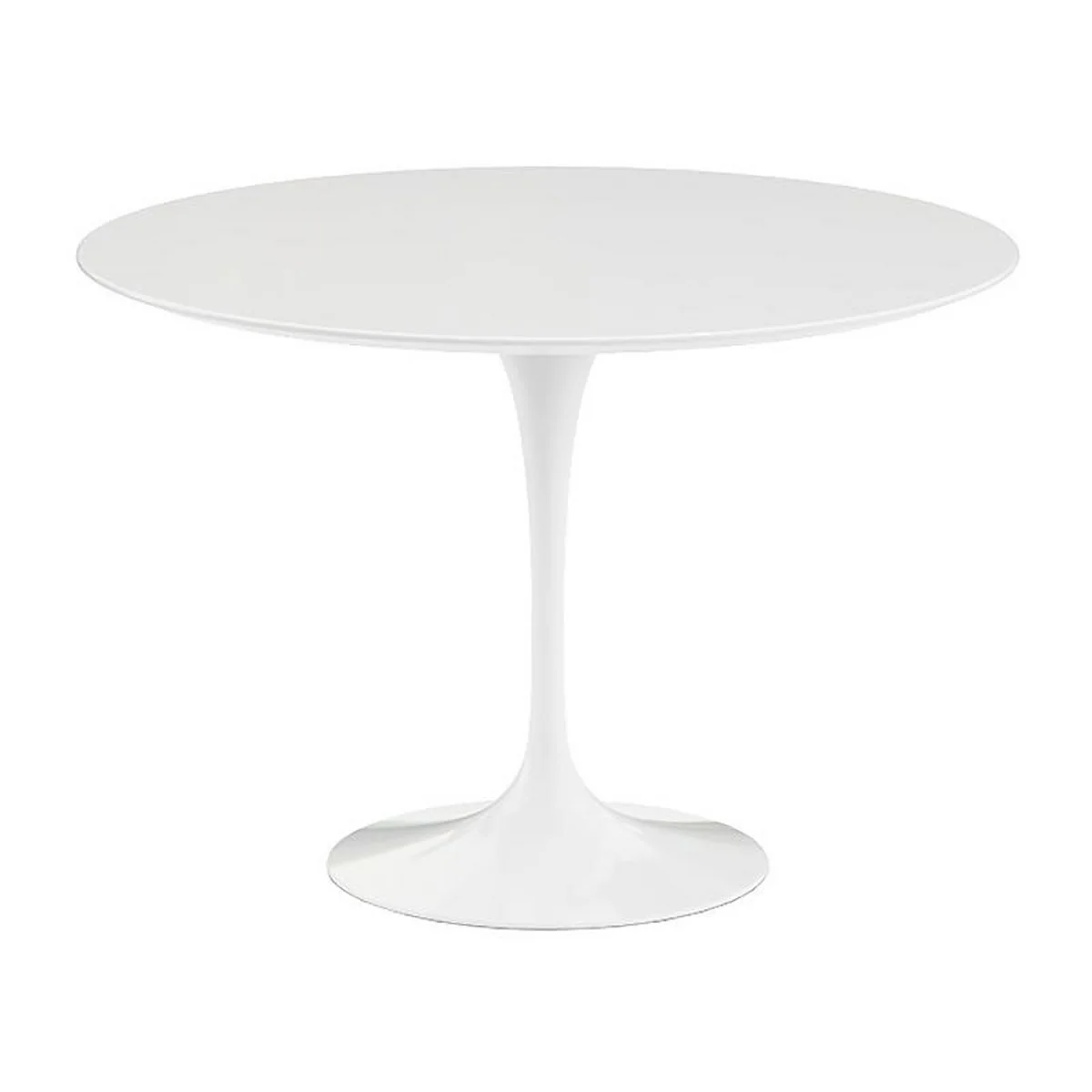 Knoll fabrique la table Saarinen Tulip avec un piétement en aluminium moulé avec revêtement Rilsan. Le plateau de table est en stratifié, disponible en différents placages de bois et en diverses variantes de marbre.