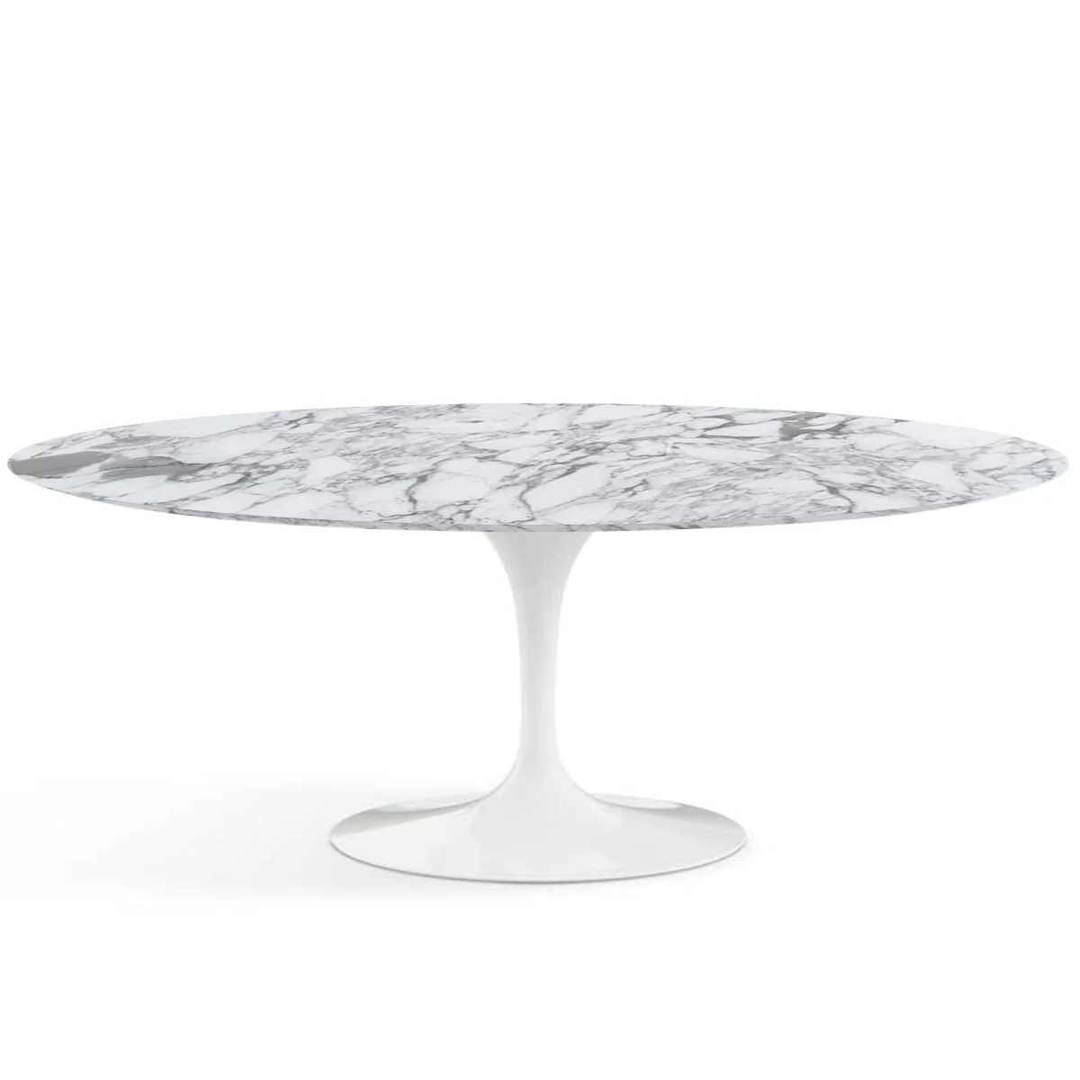 Knoll fabrique la table Saarinen Tulip avec un piétement en aluminium moulé avec revêtement Rilsan. Le plateau de table est en stratifié, disponible en différents placages de bois et en diverses variantes de marbre.