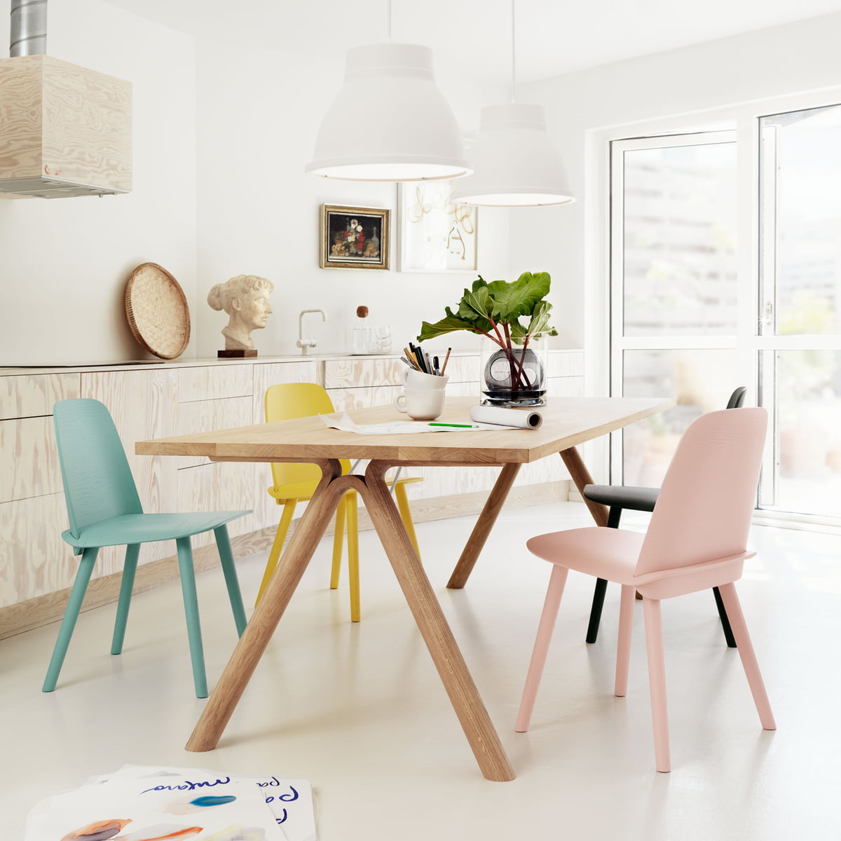 La table Split de Muuto avec ses pieds caractéristiques est disponible dans trois versions (chêne nature, frêne nature et teinté en noir).