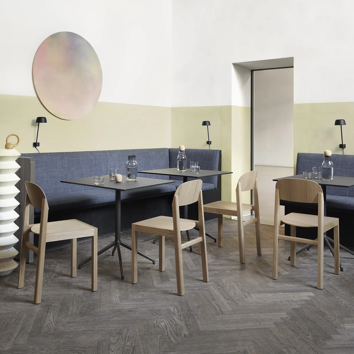 La table Still Café d'Iskos-Berlin pour Muuto se caractérise par son design angulaire et rectiligne, qui lui confère une touche noble et moderne. Le plateau carré est supporté par un piétement à quatre pieds aux bords astucieusement courbés. Tandis que le plateau de la table est laminé, la base est en acier peint par poudrage.