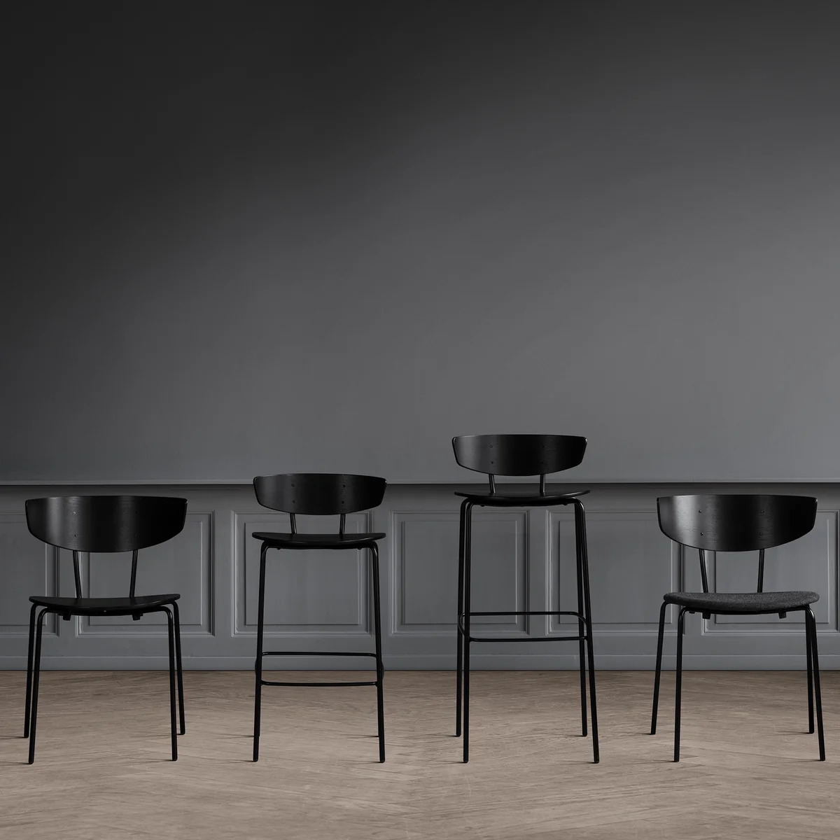 Le tabouret de bar se compose d’une structure en acier thermo-laqué en noir avec un dossier en placage de chêne en noir. La version basse faisant 64 cm de hauteur d’assise convient pour l’utilisation privée dans la cuisine et au propre bar alors que la version de 76 cm de hauteur d’assise est utilisée pour les hôtels et les bars.