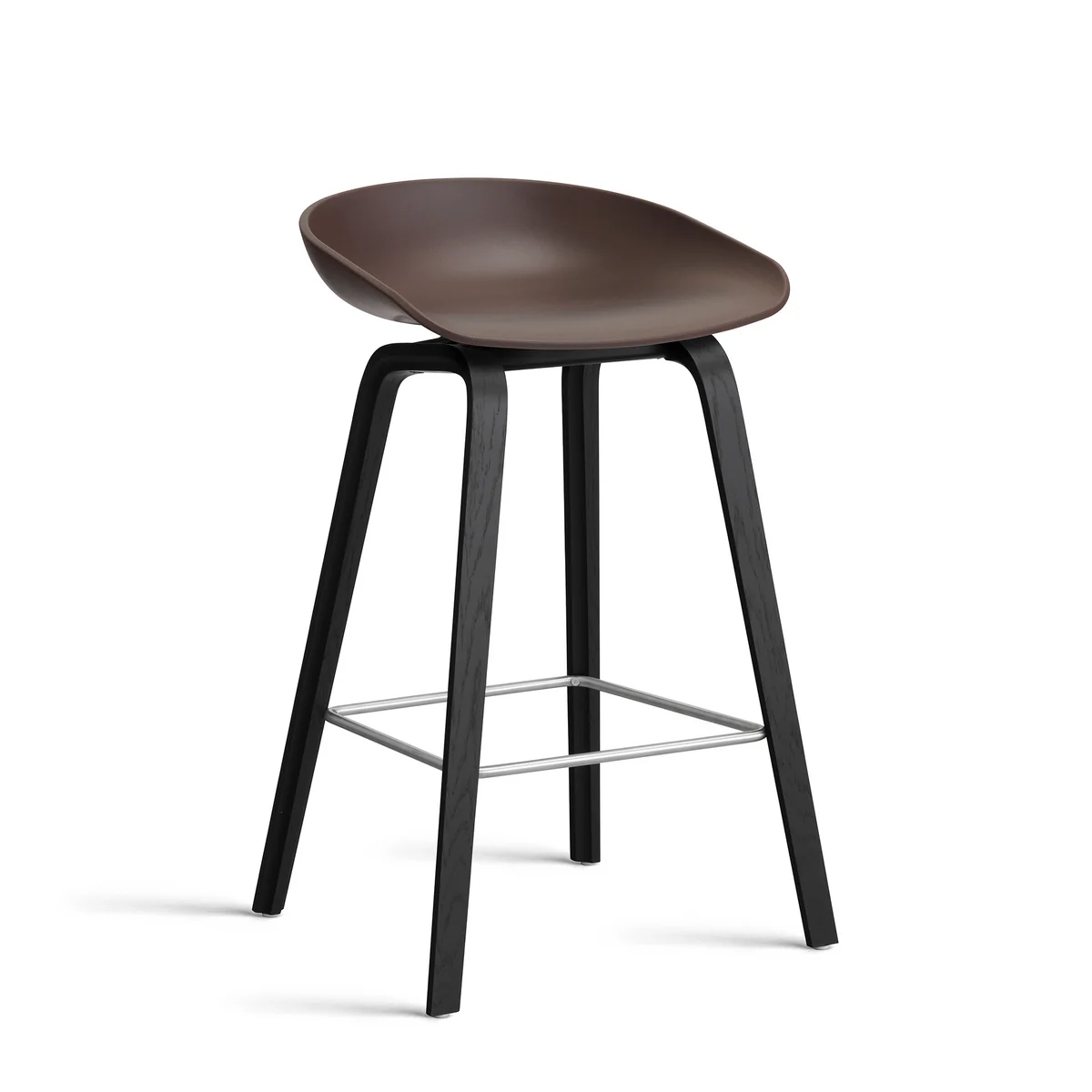 About A Stool AAS32 dispose d'une coque d'assise en polypropylène, le cadre est en contreplaqué de hêtre, disponible avec différentes combinaisons de placages et de repose-pieds.