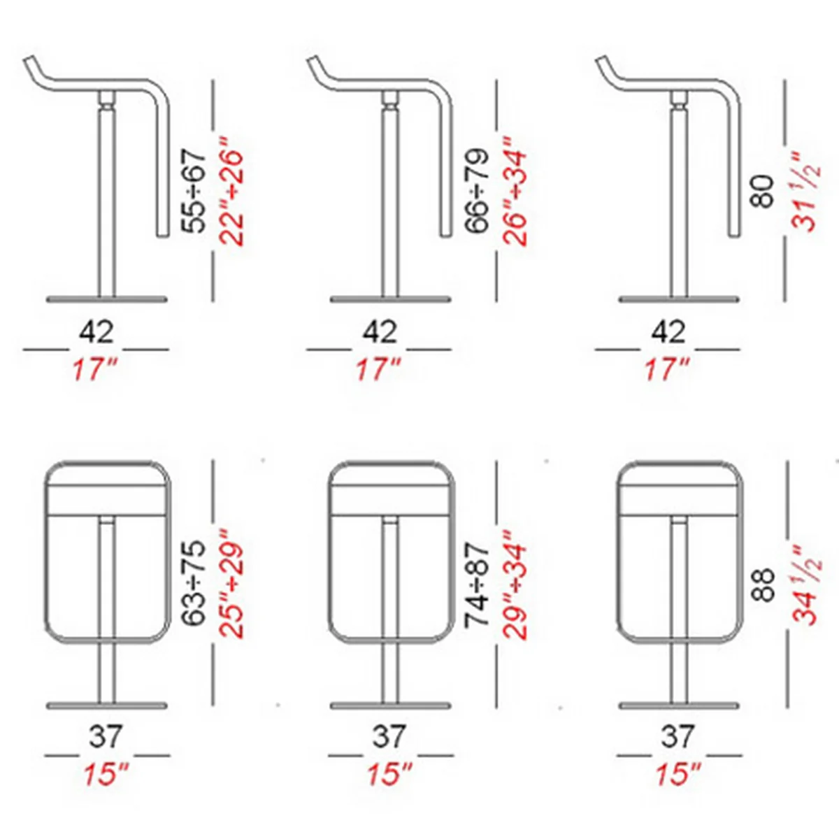 - Dimensions: hauteur variable du siège 55-67cm (pour des tables jusqu'à 85 cm de haut) et 66-79 cm (pour des tables de 85-95 cm de haut) ou une hauteur fixe de 80cm (pour des tables de 95-105 cm de haut)