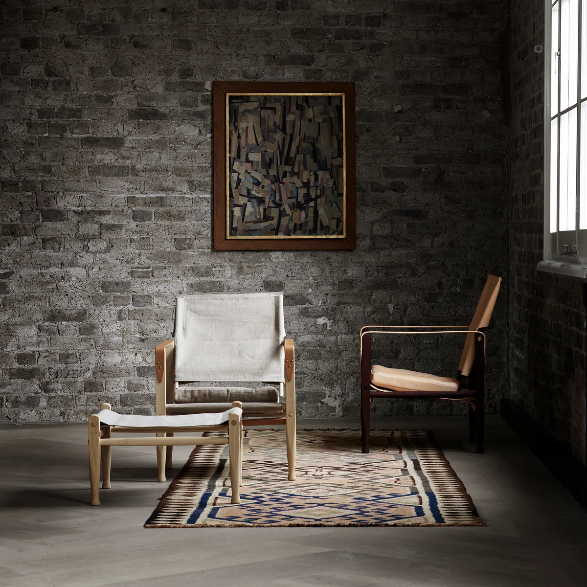 Le tabouret à quatre pieds est fabriqué à partir d'une structure en bois de frêne huilé. L'assise est réalisée en tissu Canvas de Kvadrat, composé à 90% de laine vierge et à 10% de nylon. Des boucles en cuir naturel maintiennent la construction stable et constituent un détail raffiné. Utilisé seul ou avec la KK47000 Safari Chair, ce tabouret pratique et intemporel attire l'attention dans différents intérieurs.