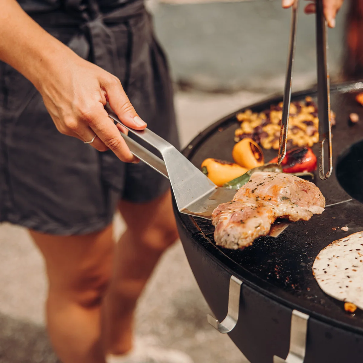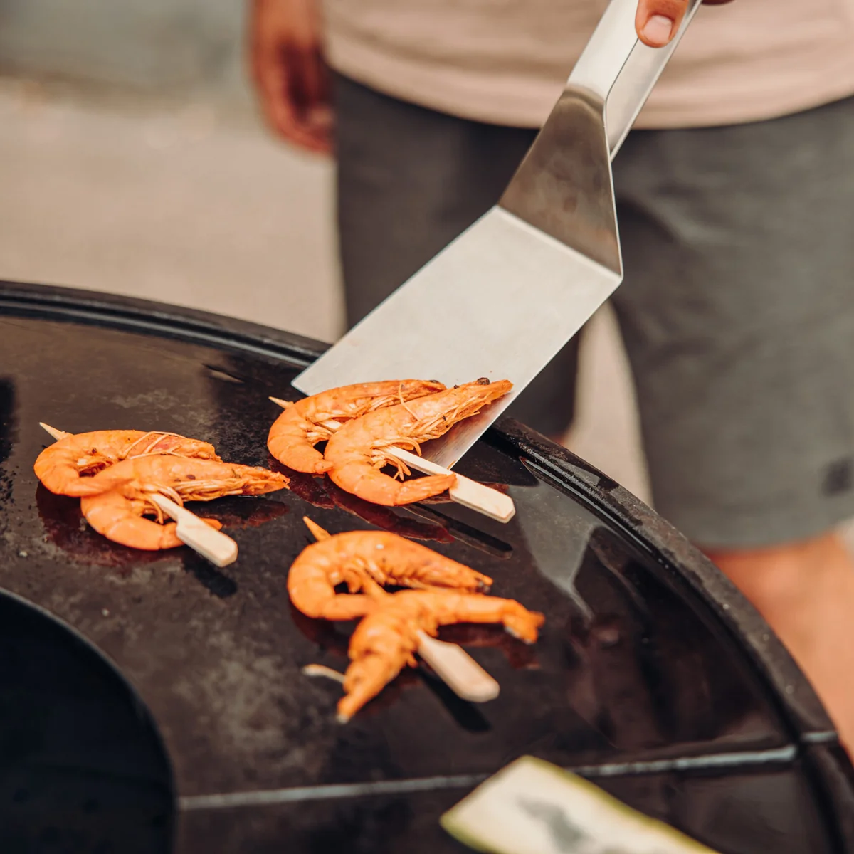 La spatule de höfats est un must-have pour les longues soirées barbecue détendues en bonne compagnie. Elle dispose d'une poignée ergonomique et d'un petit trou qui permet de la suspendre lorsqu'elle n'est pas utilisée. Elle peut être utilisée de manière multifonctionnelle. La spatule peut être utilisée pour retourner ou hacher les aliments. La spatule s'avère également très utile pour nettoyer la grille du barbecue. Fabriquée à 100% en acier inoxydable, la spatule est robuste et durable. Elle peut être facilement nettoyée dans le lave-vaisselle.