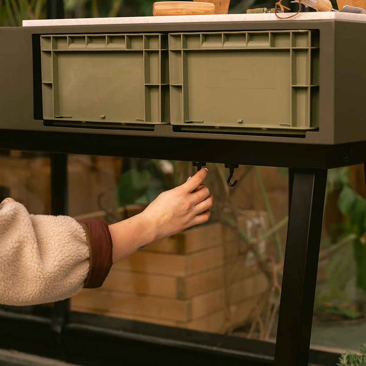 Le site Gardenworks La station de plantation de Weltevree fait du jardinage et de la cuisine en plein air un élément intuitif du quotidien. Au lieu d'être placée au fond du jardin comme les potagers et les herbiers classiques, la station est délibérément placée en position proéminente - juste à côté de la porte extérieure comme extension naturelle de la cuisine. Le meuble combine un bac à plantes avec un plan de travail spacieux à une hauteur ergonomique de 93 cm, de sorte que l'entretien du jardin et la préparation d'ingrédients frais se fassent agréablement et facilement. Sous le plan de travail, deux caisses offrent un espace de rangement supplémentaire. Le système d'arrosage intégré avec deux écoulements maintient le sol humide de manière optimale en évacuant l'eau en excès tout en conservant une couche d'eau constante pour des plantes saines.