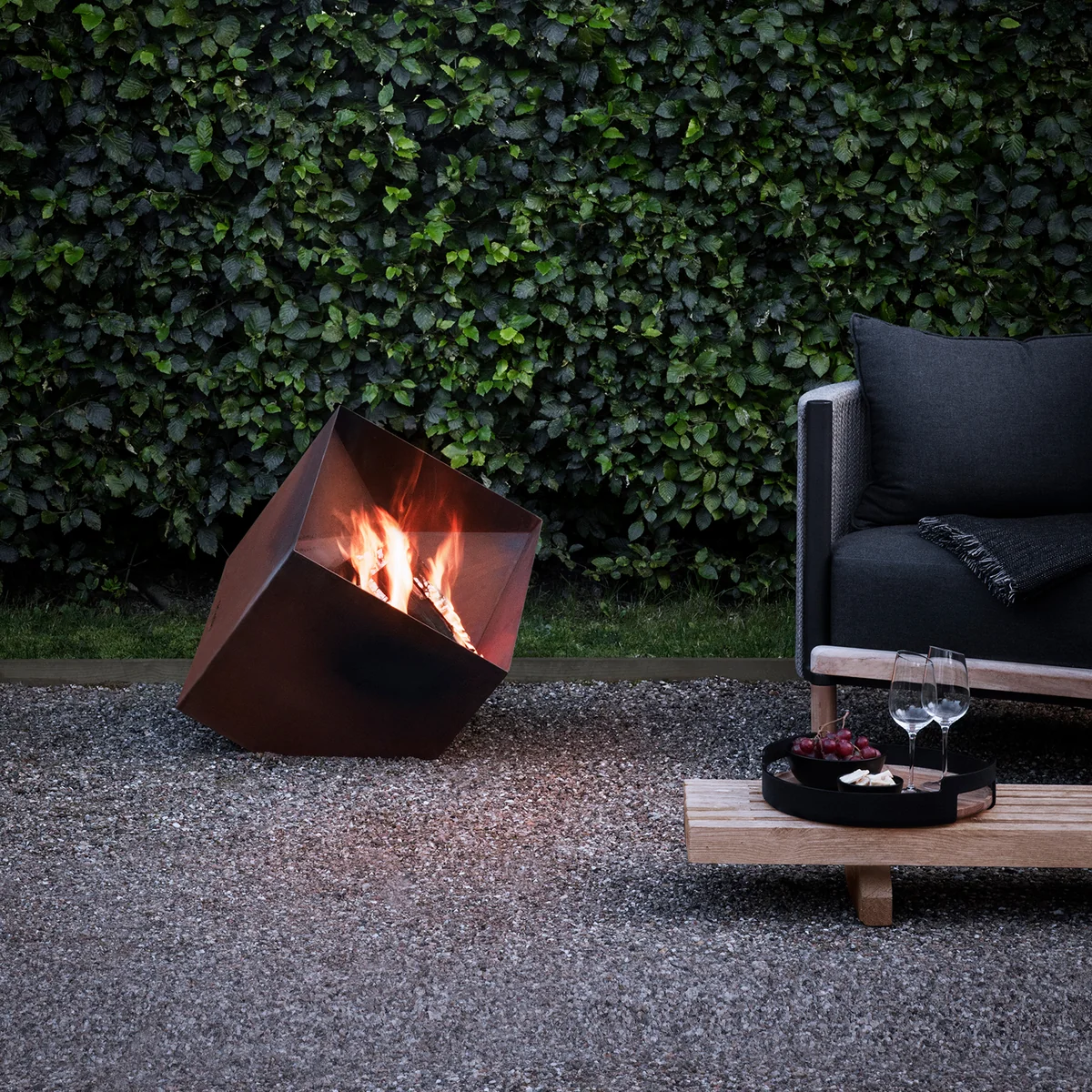 Le FireCube est très robuste et peut être laissé dehors toute l'année. Le vent et les intempéries font qu'une belle patine caractéristique se développe sur la surface. Contrairement à la rouille normale, celle-ci ne se décolore pas.