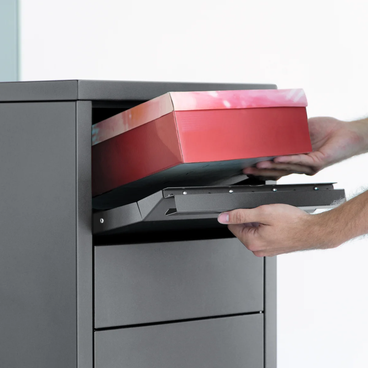 Letterman Standing Ovation est équipée d’une goulotte de grande envergure et offre maintenant aussi de la place pour les paquets ou les dossiers d’archive. L’attente ennuyeuse du facteur devient obsolète et il n’est désormais plus nécessaire d’être présent à la maison pour réceptionner son paquet.