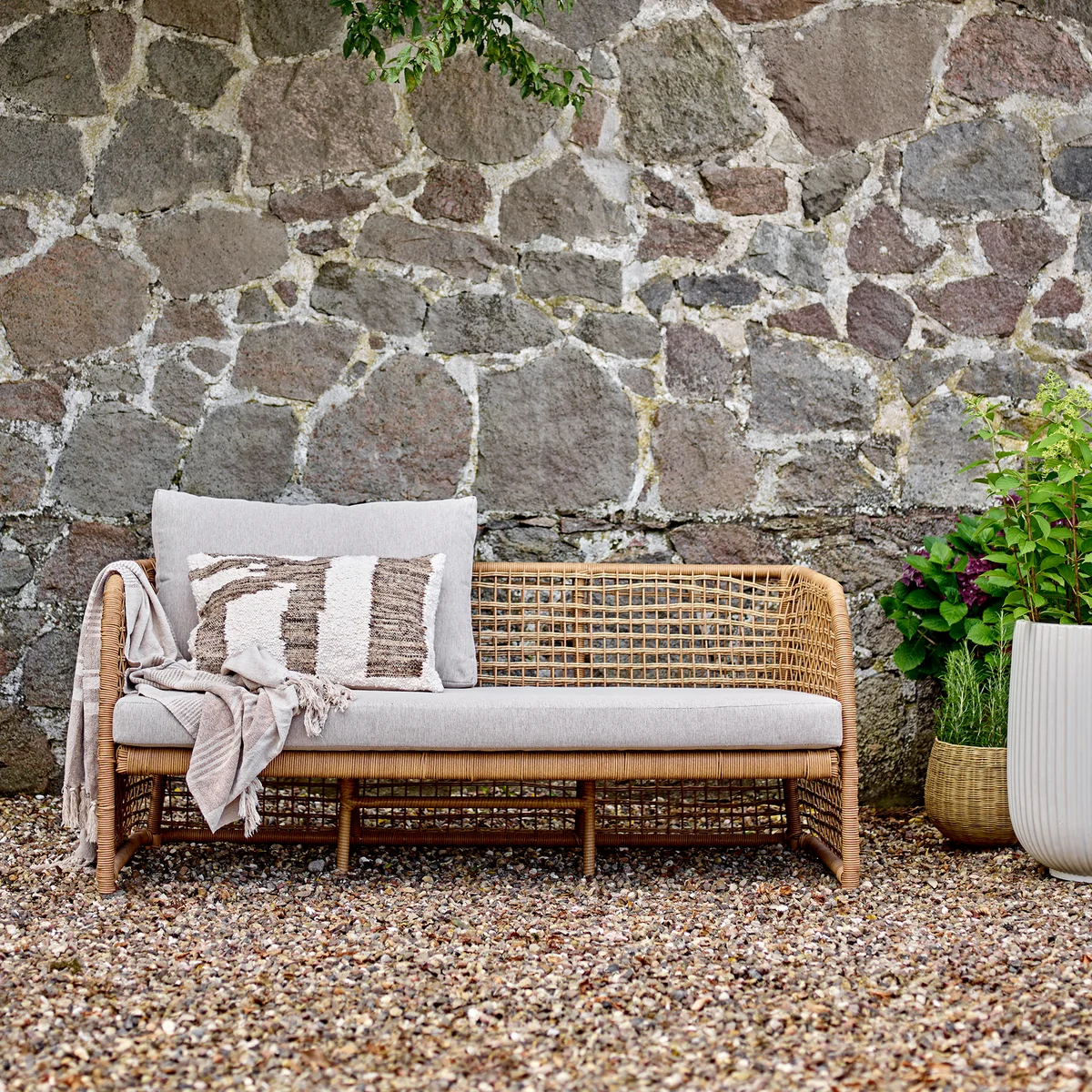 Le canapé Penzano de Bloomingville apporte une atmosphère confortable et accueillante à l'extérieur avec son design aéré en poly rotin et ses coussins moelleux en qualité tissée. Idéal pour la terrasse ou le jardin, il invite à la détente et au repos - de préférence combiné avec d'autres matériaux et textures naturels.