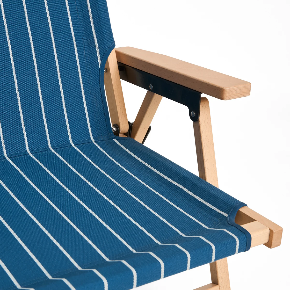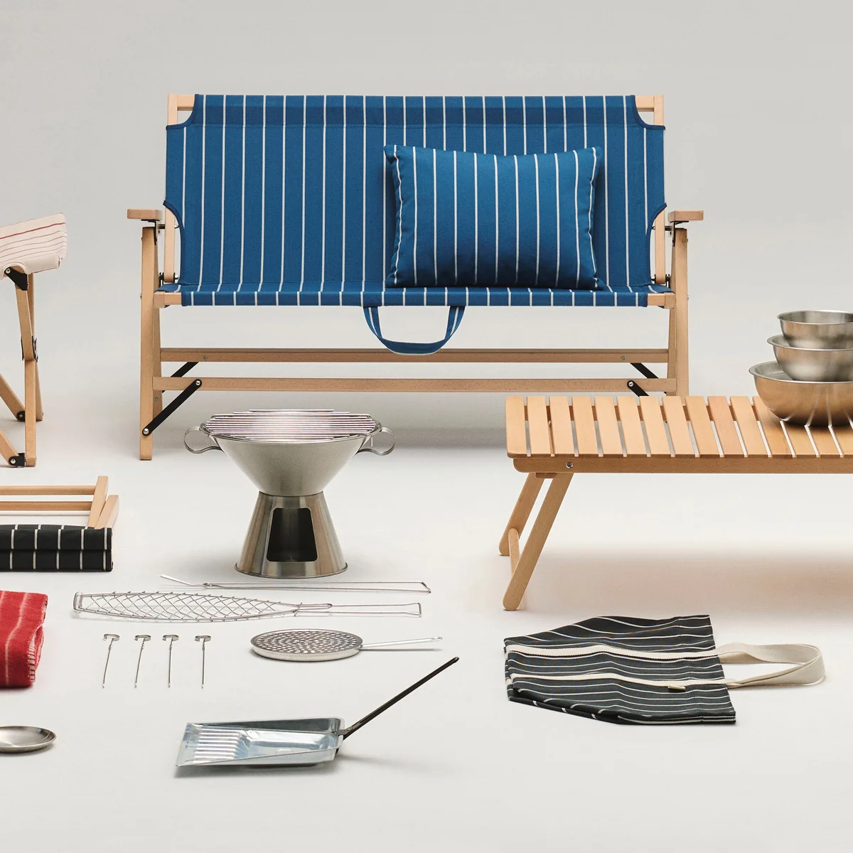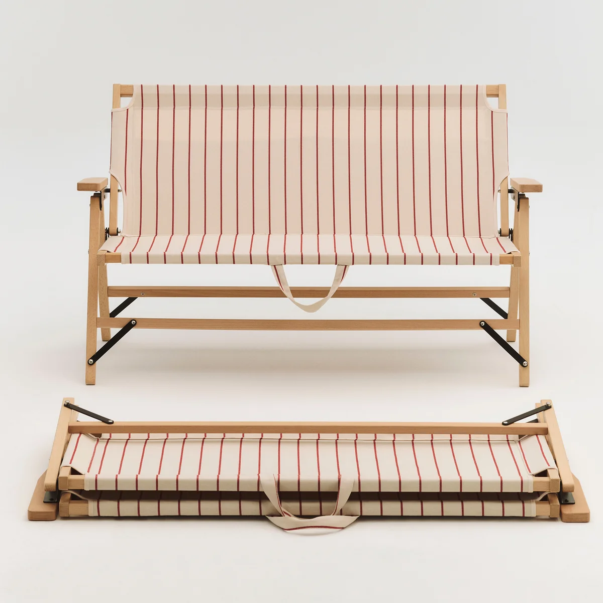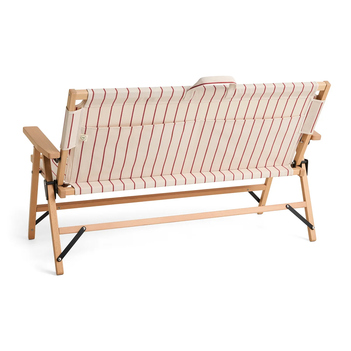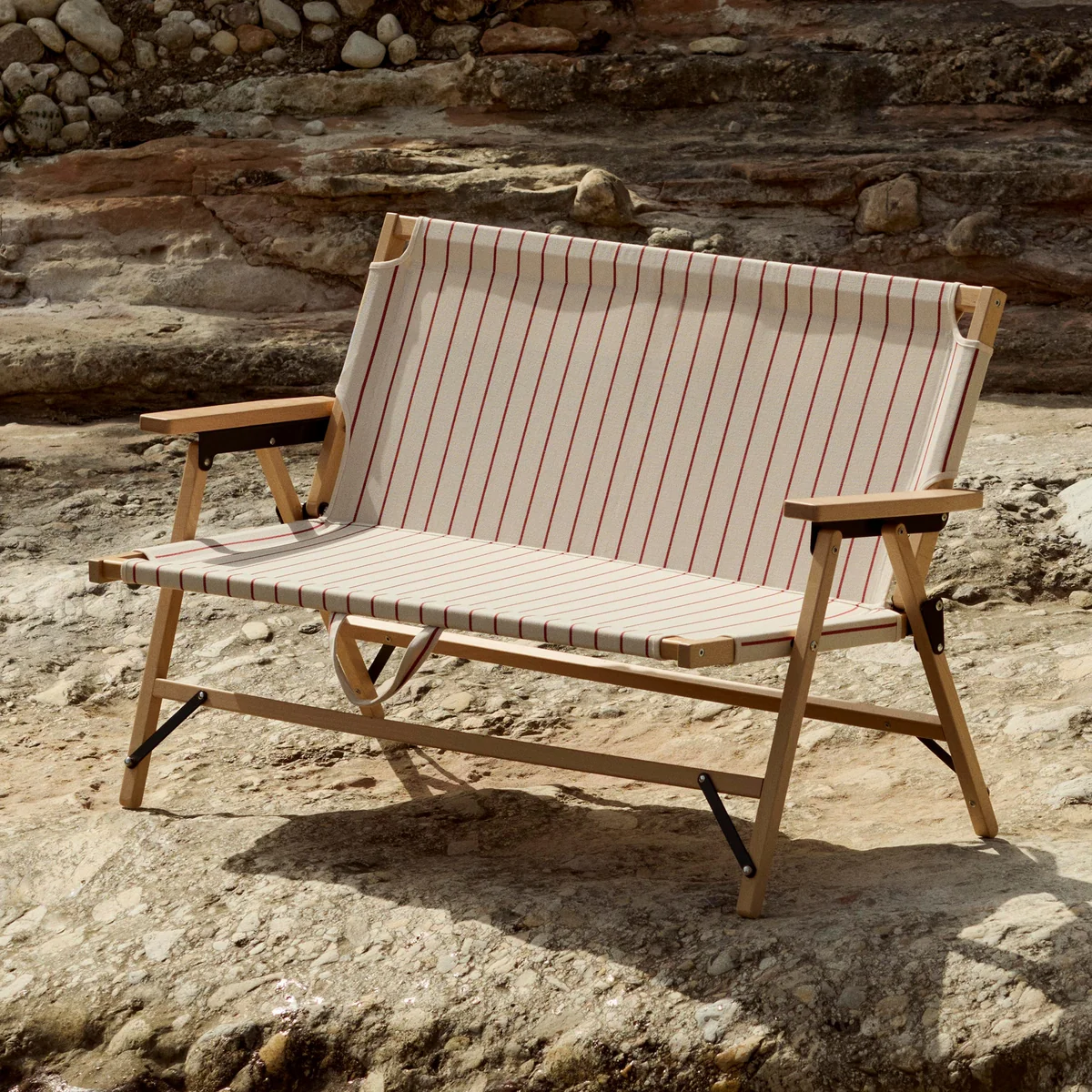 Le canapé pliant Outdoor Market allie confort d'assise décontracté et fonctionnalité portable. La structure légère en bois de hêtre est complétée par une assise rayée en polyester recyclé, créant ainsi une combinaison équilibrée de matériaux naturels et d'esthétique d'extérieur moderne. Des poignées intégrées sur l'assise et le dossier facilitent le transport, tandis que le canapé se plie de manière compacte.