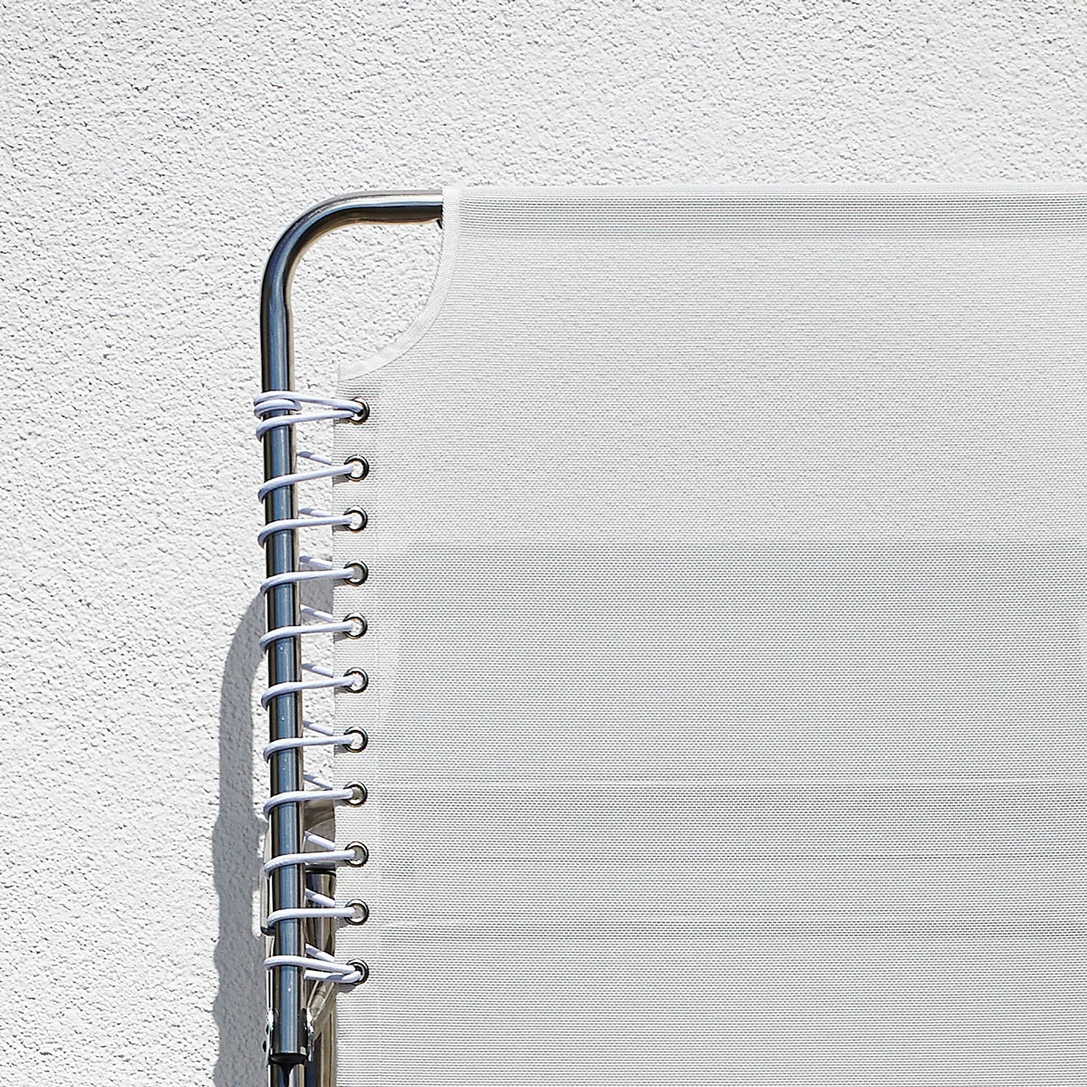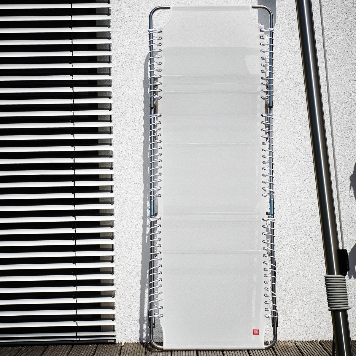 La housse de la chaise longue de Fiam est fabriquée en Textilene, un tissu de haute technologie qui résiste aux intempéries et aux UV. Le Textilene est si flexible et perméable à l'air qu'il permet de s'asseoir et de se coucher confortablement. Ce textile moderne est également facile à entretenir et à nettoyer. La couverture de la grande chaise longue de Fiam est montée sur ressorts pour un confort supplémentaire.