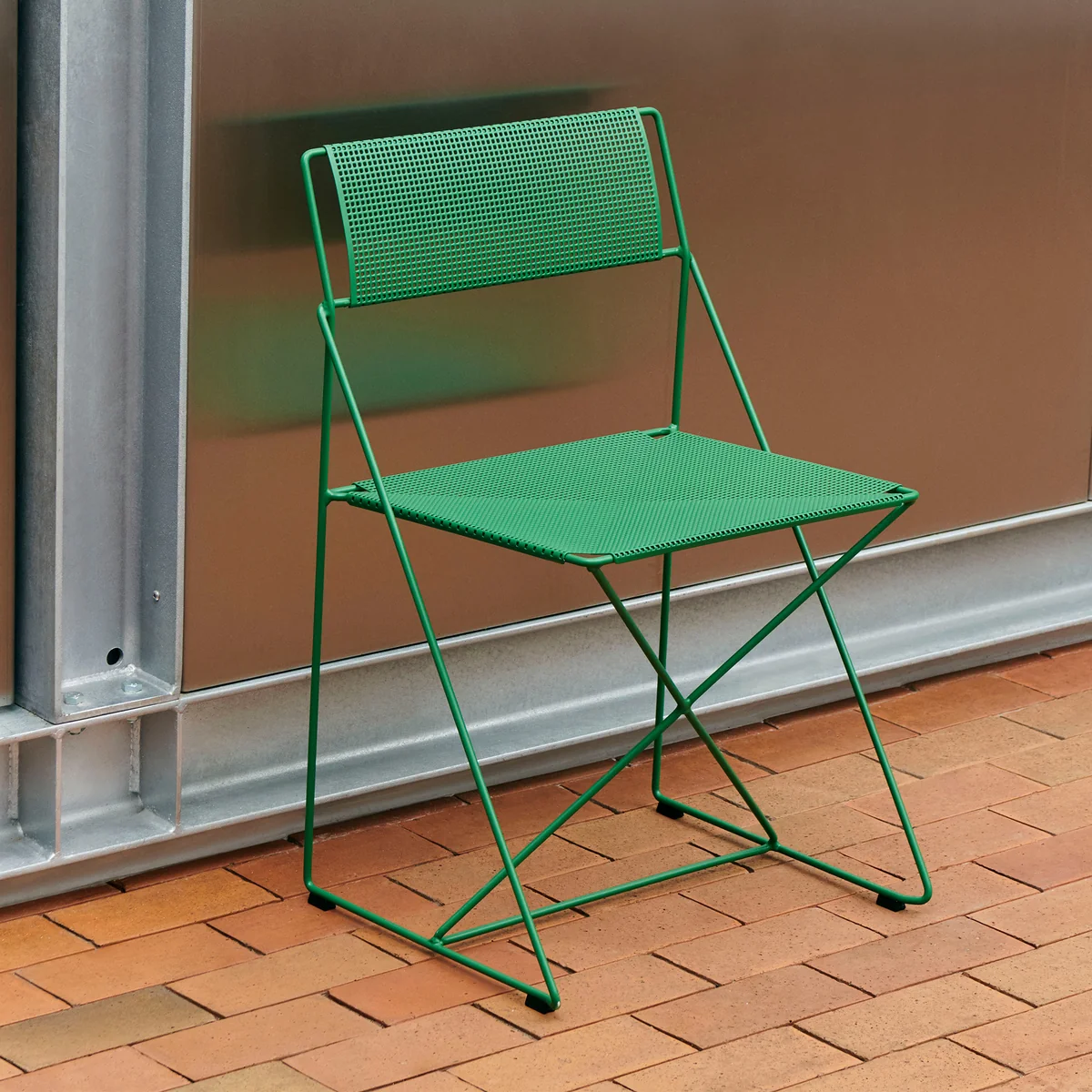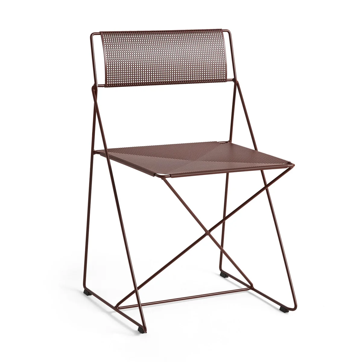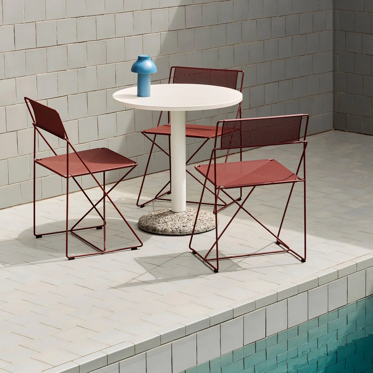 La chaise X-Line Outdoor Chair de HAY , conçue par Niels Jørgen Haugesen à la fin des années 1970, est un classique intemporel au design moderne. Fabriquée en fil métallique fin, la chaise allie le charme industriel à une construction en acier précise et constitue un exemple remarquable du mouvement high-tech des années 70.