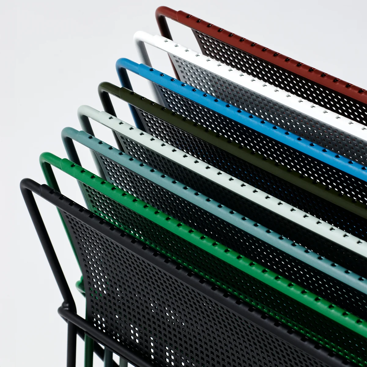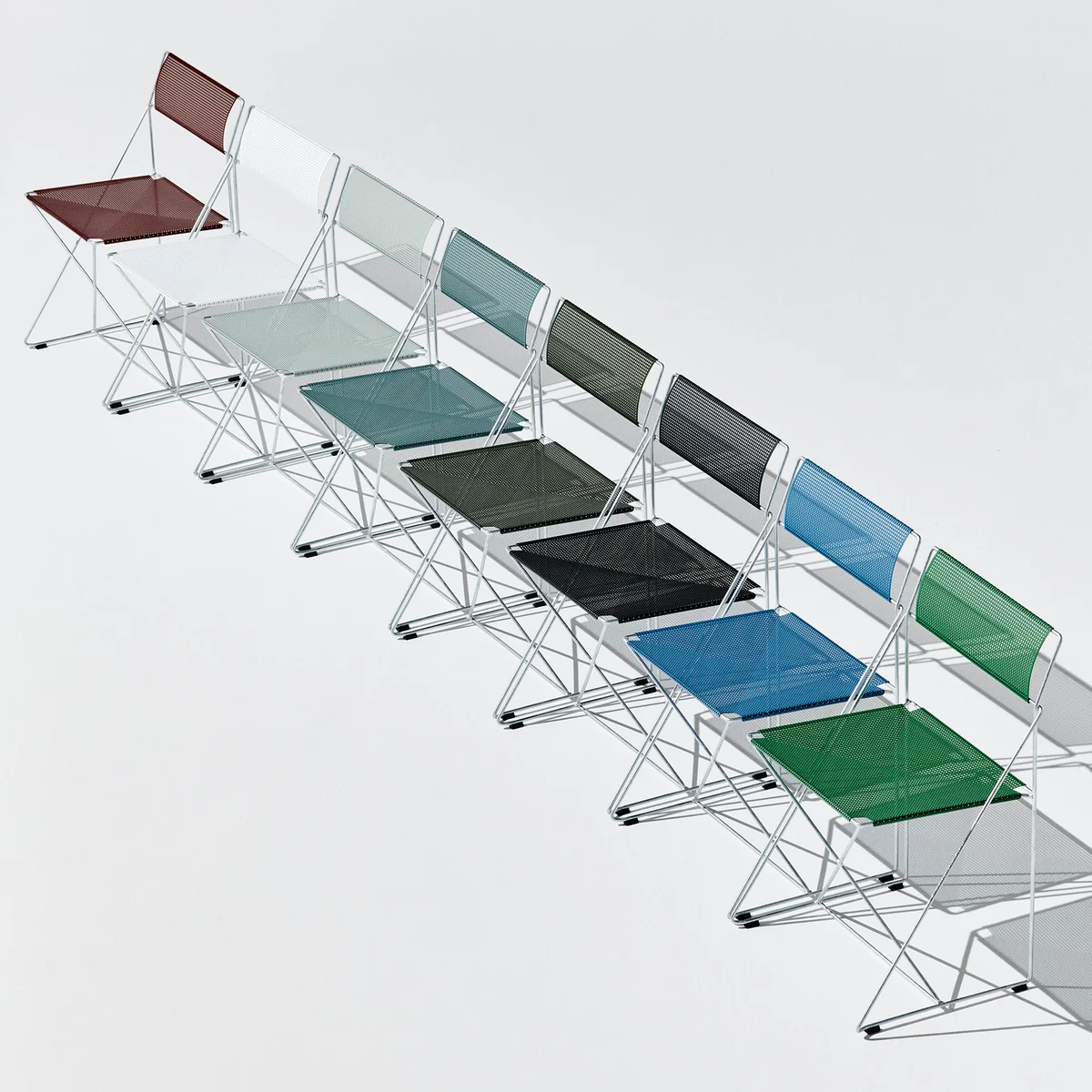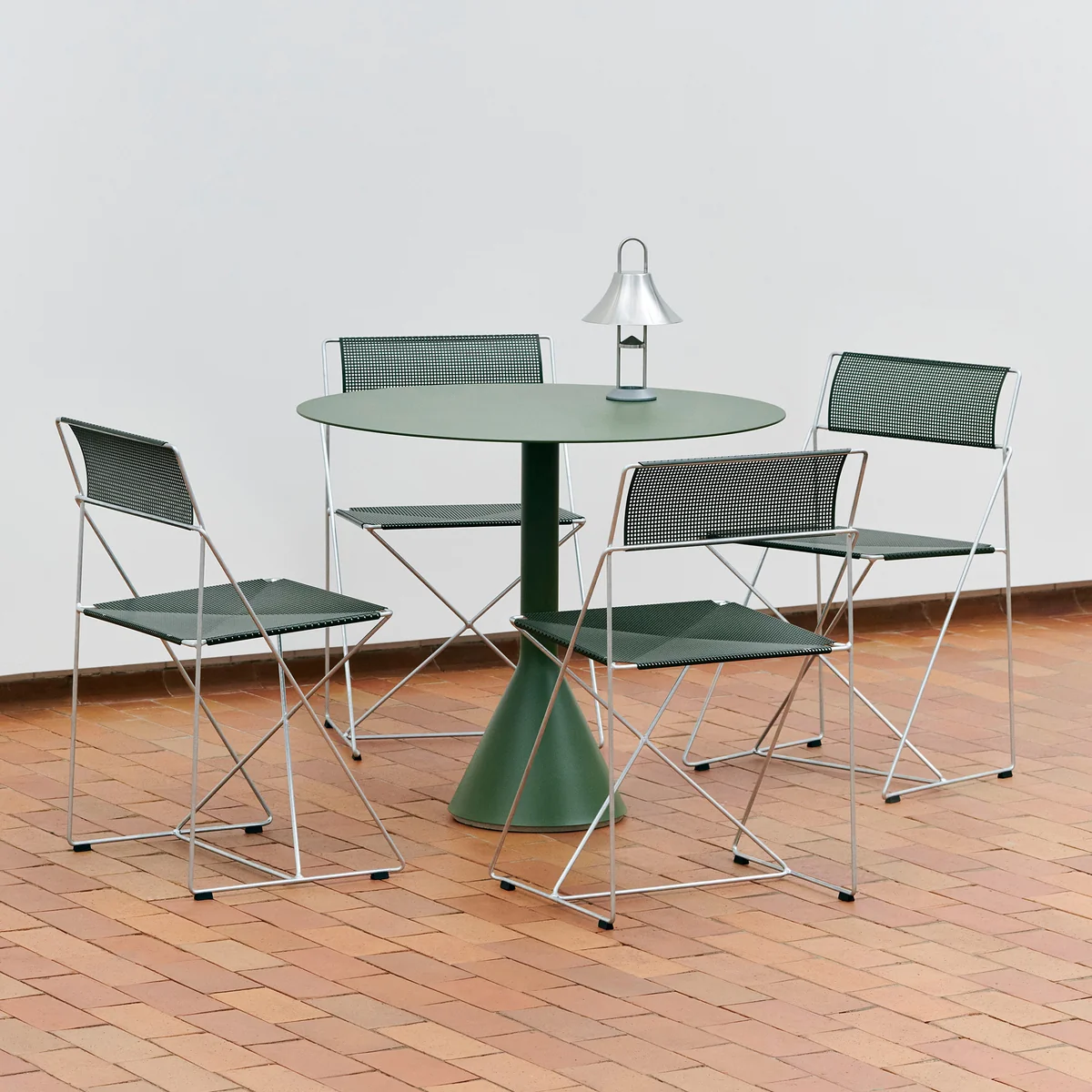 La chaise X-Line Outdoor Chair de HAY , conçue par Niels Jørgen Haugesen à la fin des années 1970, est un classique intemporel au design moderne. Fabriquée en fil métallique fin, la chaise allie le charme industriel à une construction en acier précise et constitue un exemple remarquable du mouvement high-tech des années 70.