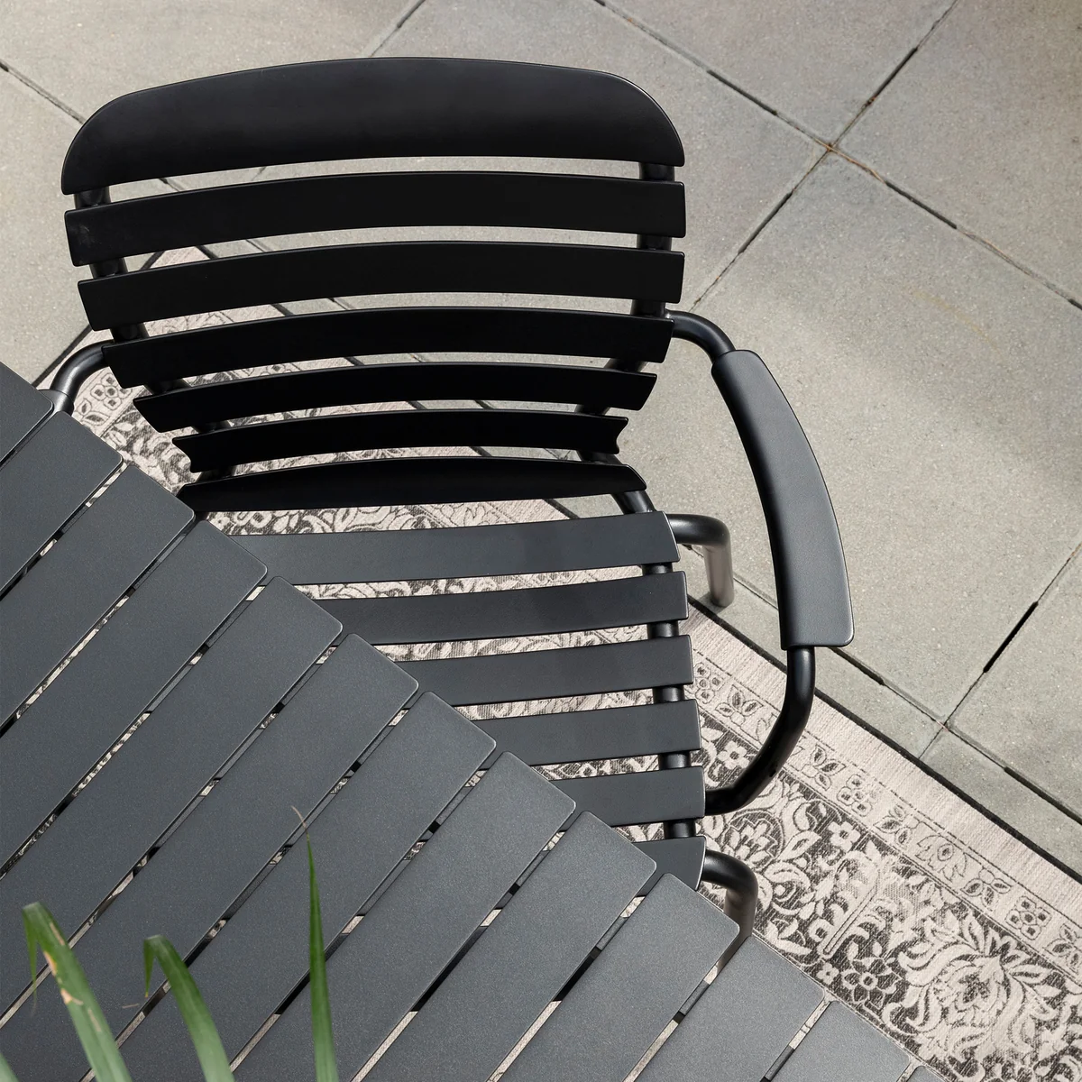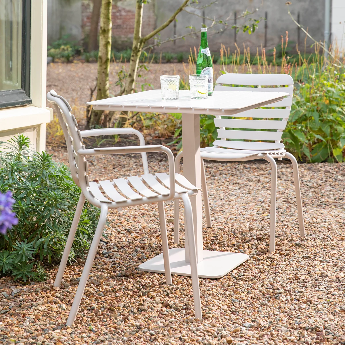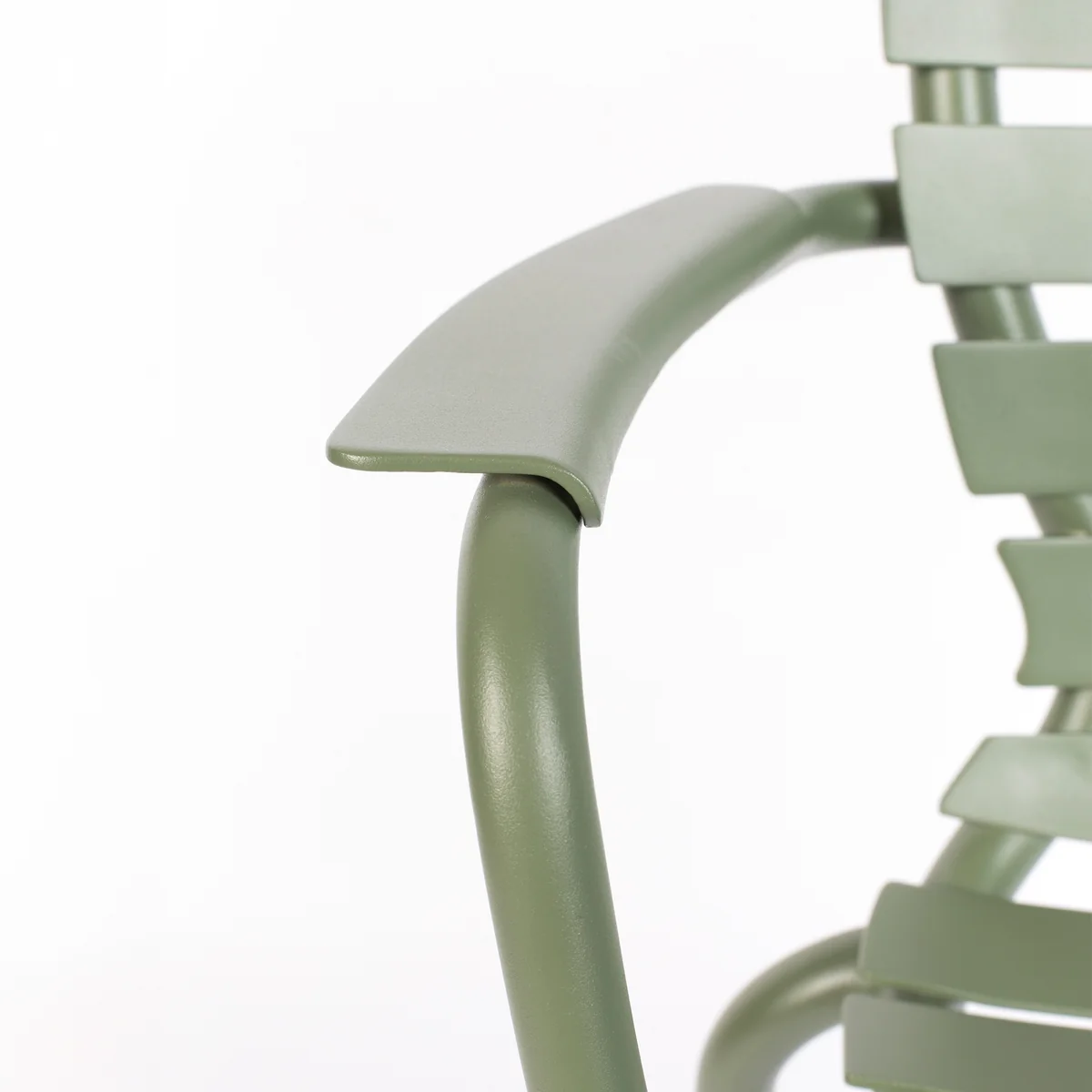 Son design minimaliste est complété par des courbes douces et un élégant revêtement en poudre qui lui confère une modernité intemporelle. Grâce à sa construction robuste en aluminium, la chaise défie les éléments toute l'année - tout en restant étonnamment légère et flexible dans sa manipulation. Les accoudoirs intégrés apportent un confort supplémentaire, tandis que le design empilable s'avère particulièrement pratique pour le stockage.