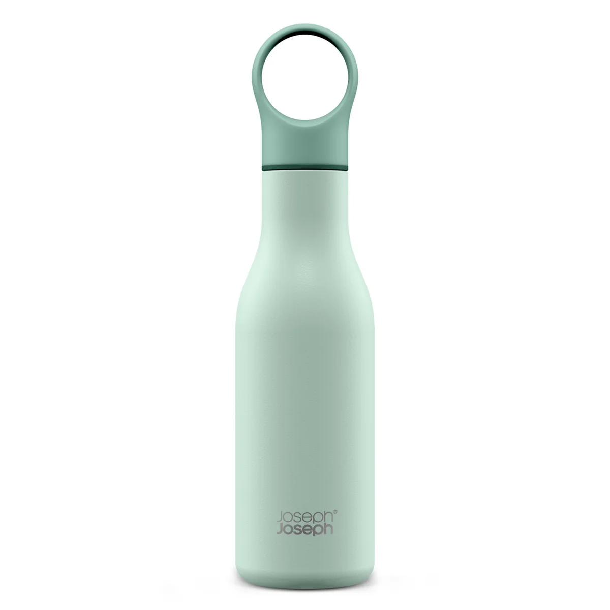 Joseph Joseph donne un nouveau visage à un Loop Cette gourde donne un nouveau look à une gourde classique. La bouteille isolée sous vide contient 500 ml et convient aux boissons chaudes et froides. La fermeture avec poignée en boucle ne garantit pas seulement un transport facile. La boucle permet également de mettre facilement le bouchon sur la bouteille pour un rangement aisé.