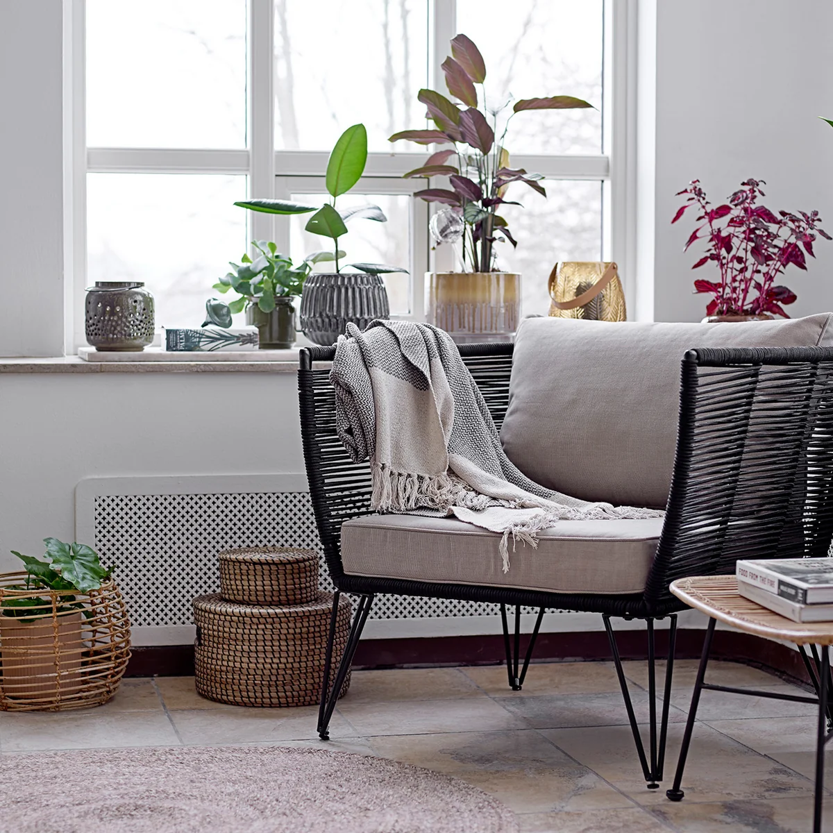 Le lounge chair Mundo de Bloomingville est un fauteuil confortable avec des accoudoirs et un dossier enveloppant par son capitonnage douillet, pour l'extérieur. Le fauteuil est composé d'une structure en acier avec un tressage décoratif en polyester. Le revêtement de l'assise et le coussin sont également en polyester résistant aux intempéries.