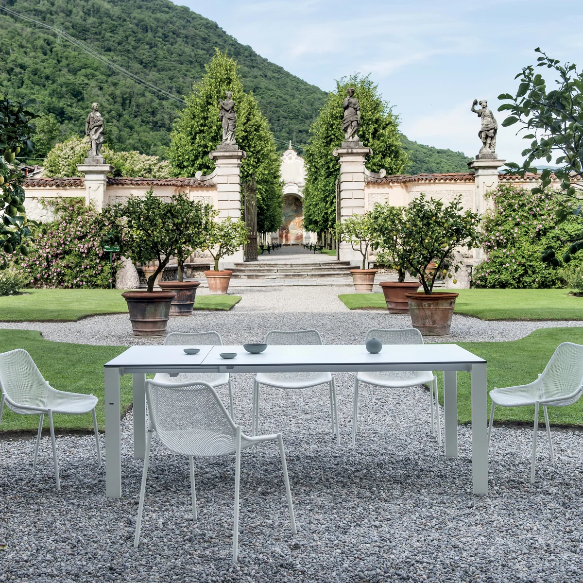 La chaise de jardin Round par Christophe Pillet pour Emu est une chaise d'extérieur dont la surface est en métal déployé en forme de losange, à l'origine de son aspect léger, comme en suspension.