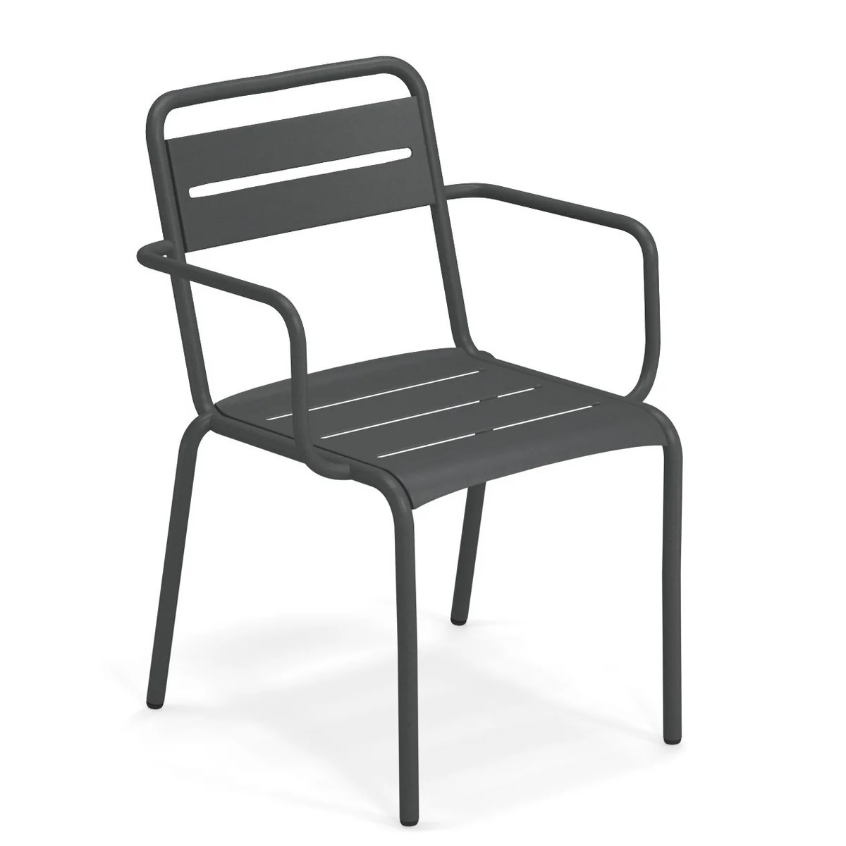 La chaise peut être combinée Star La chaise avec accoudoirs peut être combinée avec la table et le banc assortis. Un coin salon confortable peut ainsi être aménagé sur la terrasse, invitant à des soirées barbecue entre amis ou en famille. La chaise est disponible en différentes couleurs.