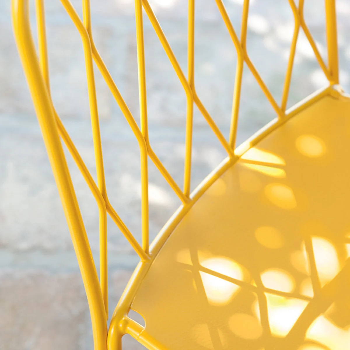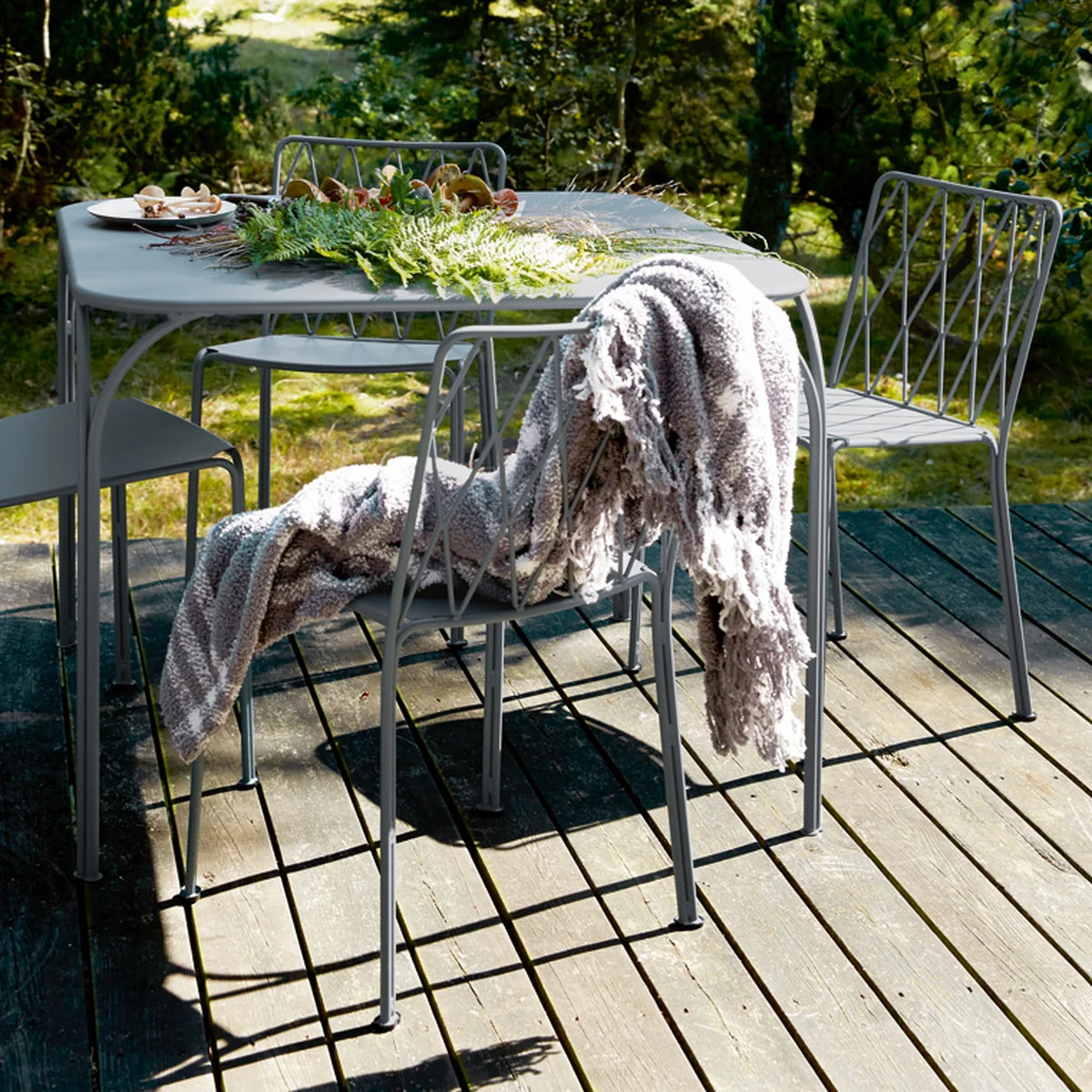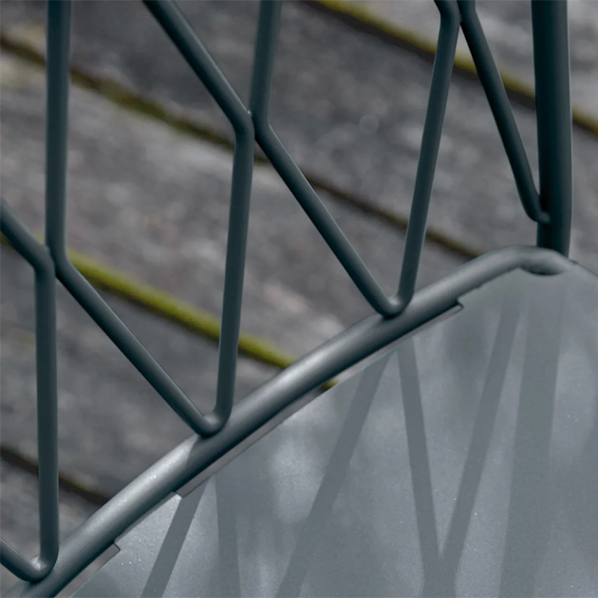 En tant que spécialiste de l'extérieur, Fermob fabrique la chaise Kintbury en fil d'acier avec une assise en tôle d'acier résistant aux intempéries et aux UV grâce à un traitement de protection spécial. Les meubles de jardin sont fabriqués en acier. Ils sont aussi extrêmement solides malgré leur design en filigrane.
