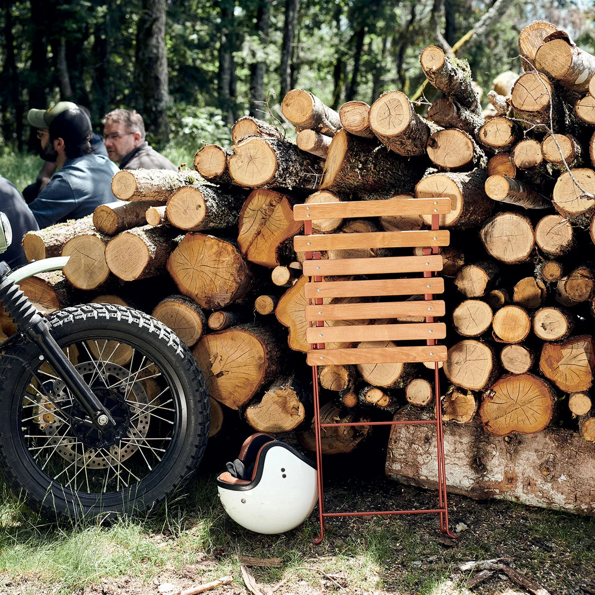 Aujourd'hui encore, l'esprit de la collection Bistro n'a rien perdu de son charme. La chaise pliante Naturel apparaît sous une forme classique, mais avec des lattes en bois. Alors que la structure est toujours en métal, l'assise est fabriquée en bois de hêtre, un matériau naturel qui, grâce à un traitement spécial, résiste aux intempéries, aux UV et est extrêmement durable.
