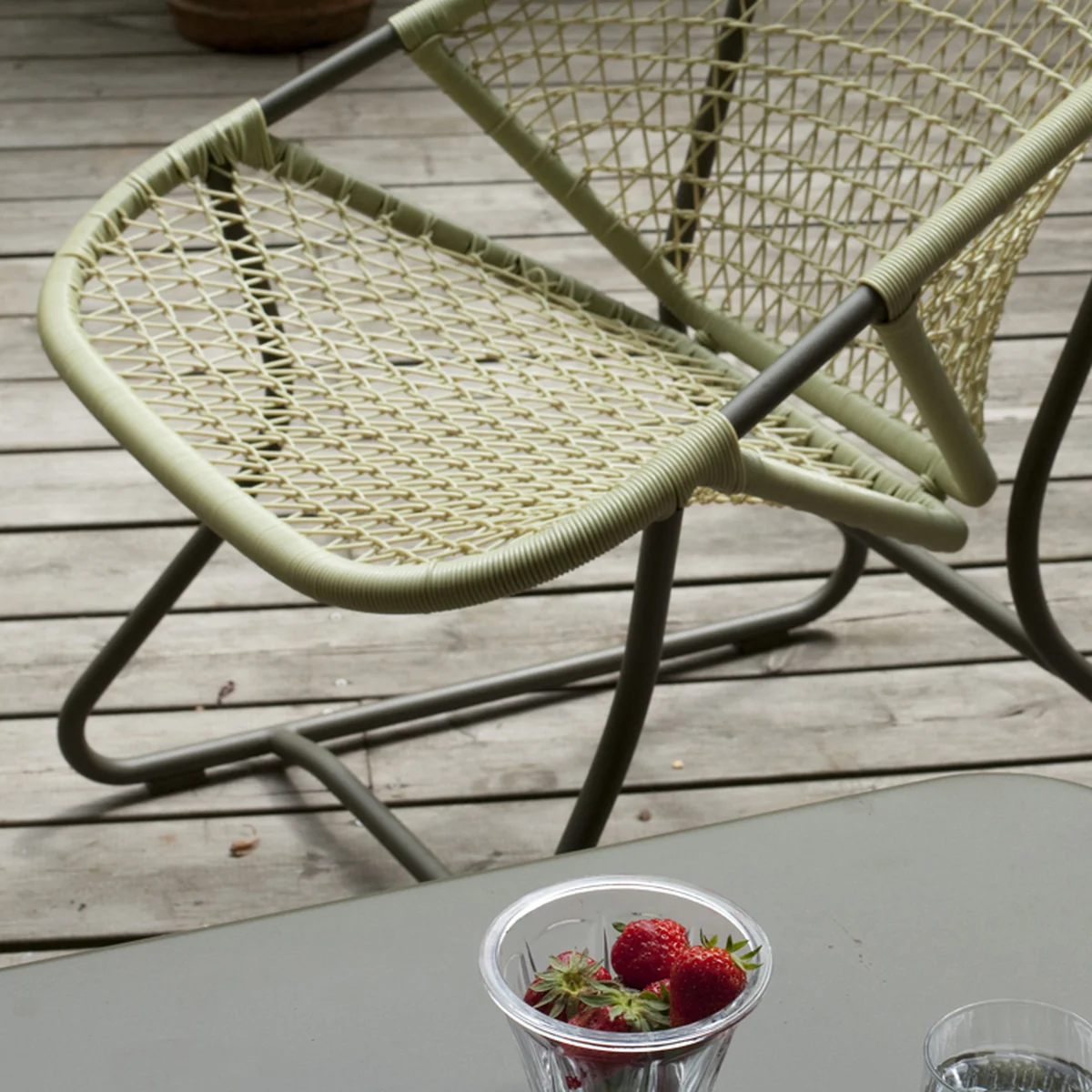 Le siège en résine tressée, combiné au tube d'aluminium du cadre, crée une légèreté visuelle réelle. Le siège est tissé selon un motif Kriss-Kross très stable. L'ensemble Sixties a reçu un traitement de protection de Fermob afin de pouvoir être utilisé à l'extérieur sans problème. Le cadre est thermolaqué résistant aux rayons UV.