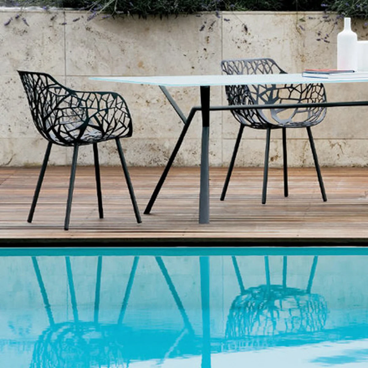 Le modèle d'extérieur présenté ici est composé d'aluminium revêtu par poudre. Forest convainc par un grand confort d'assise et un design exceptionnel. La structure arborescente de la coque d'assise suscite des associations avec une forêt (en angl. Forest) d'où la chaise de jardin filigrane tient son nom.
