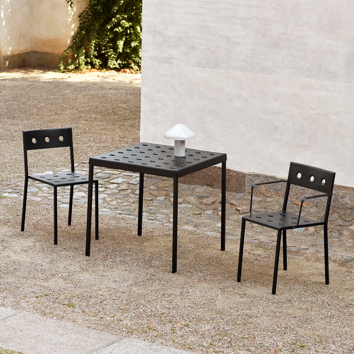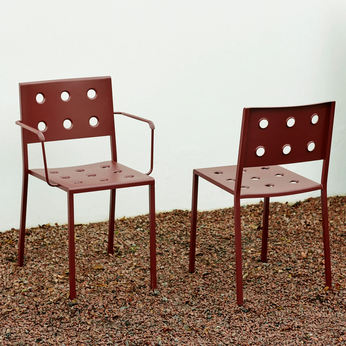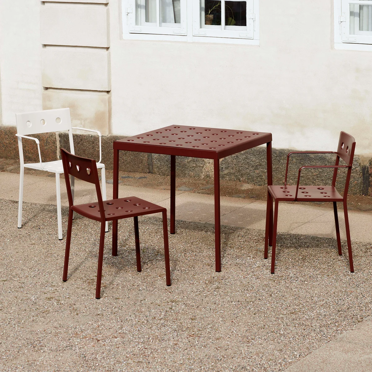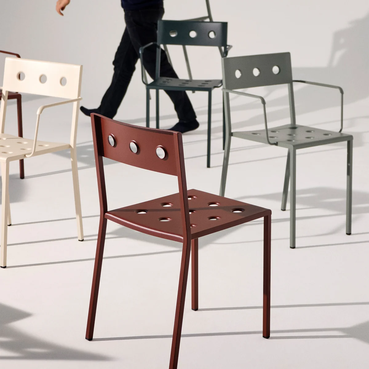 La chaise Balcony chaise de Ronan et Erwan Bouroullec pour HAY est une chaise de salle à manger élégante et fonctionnelle pour l'extérieur. Le design large et carré a un aspect plus doux grâce à l'assise et au dossier arrondis. Les trous dans l'assise et le dossier confèrent de la stabilité à la construction et assurent en outre une expression particulière. La chaise Balcony La chaise est fabriquée en acier laqué époxy avec un revêtement qui garantit sa résistance et sa durabilité, ce qui la rend idéale pour l'extérieur.