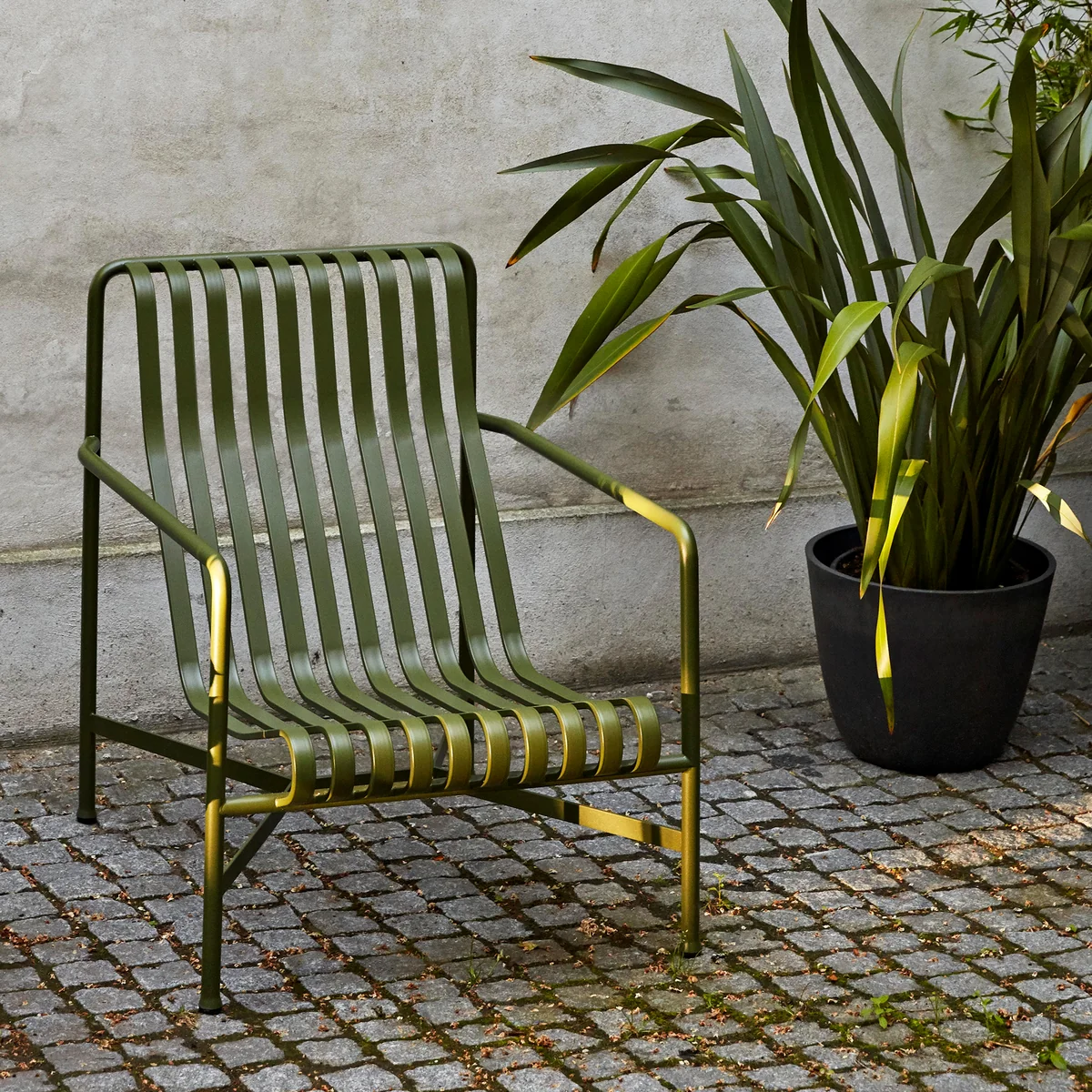 En tant que membre de la collection Palissade, ce fauteuil d'extérieur peut être combiné avec d'autres meubles. Palissade Lounge Chair High parfaitement avec d'autres meubles de jardin, bancs et chaises de la HAY en différentes couleurs.