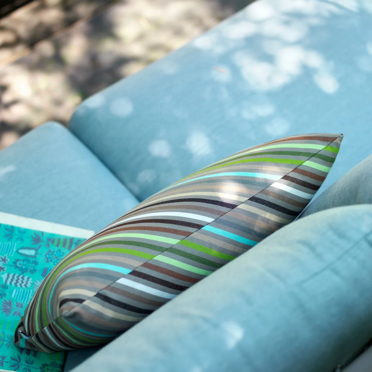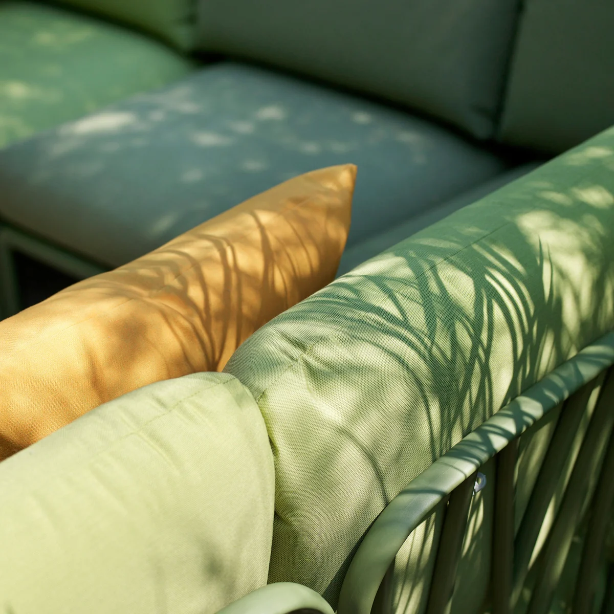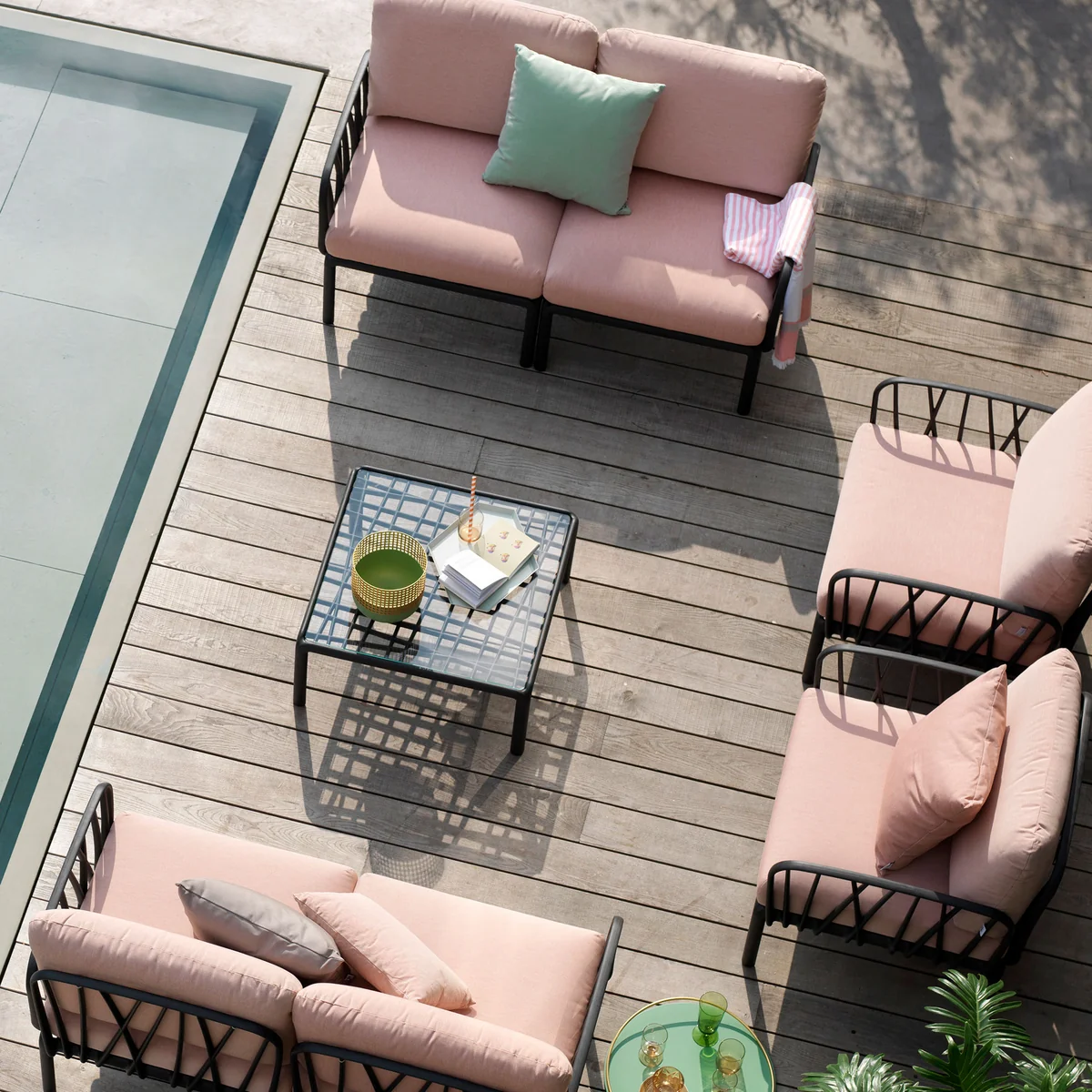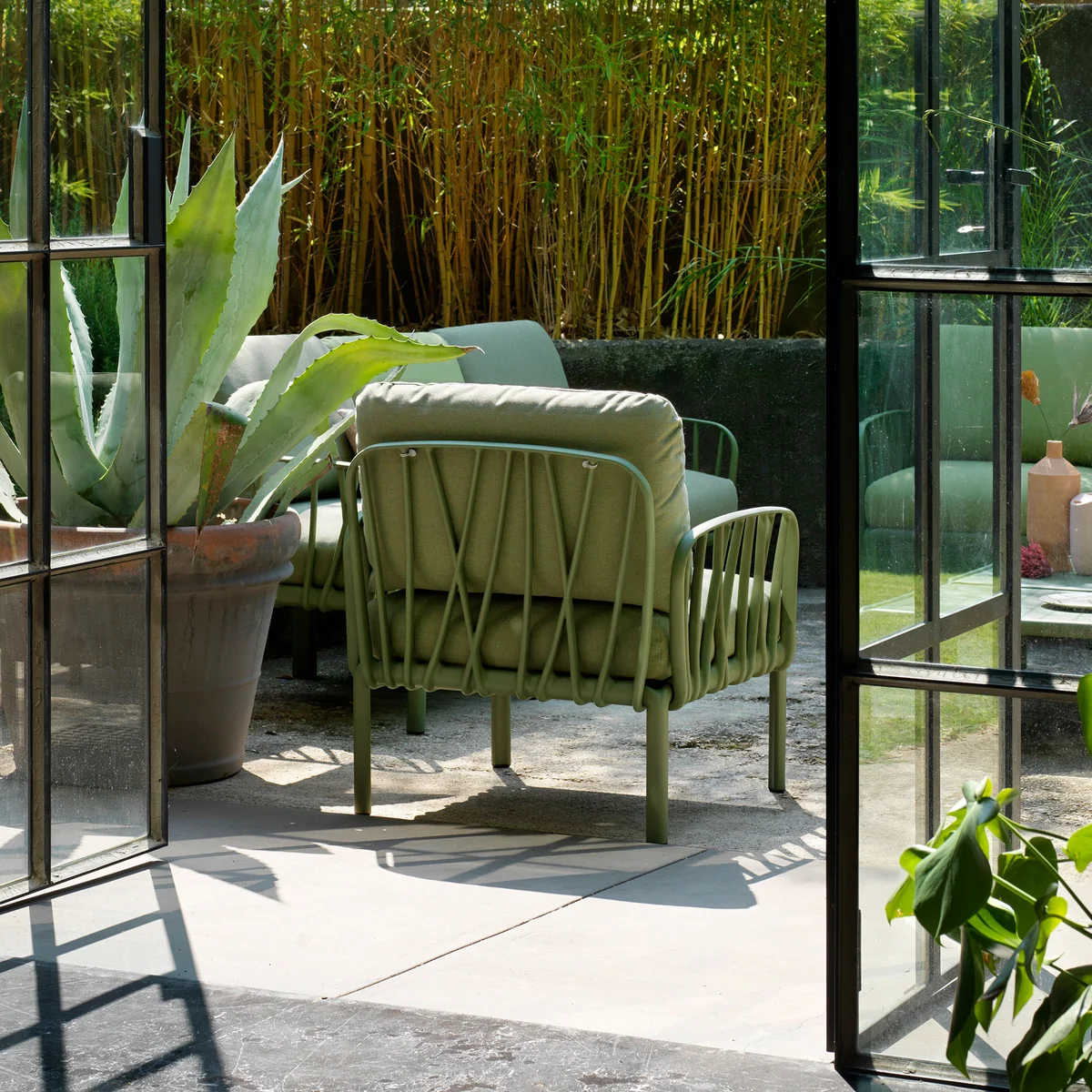 Le design du canapé modulaire, en particulier ses accoudoirs, rappelle les branches d'arbres, ce qui donne un aspect naturel qui s'intègre parfaitement dans le jardin. Le canapé invite également à s'installer confortablement sur le balcon ou la terrasse.