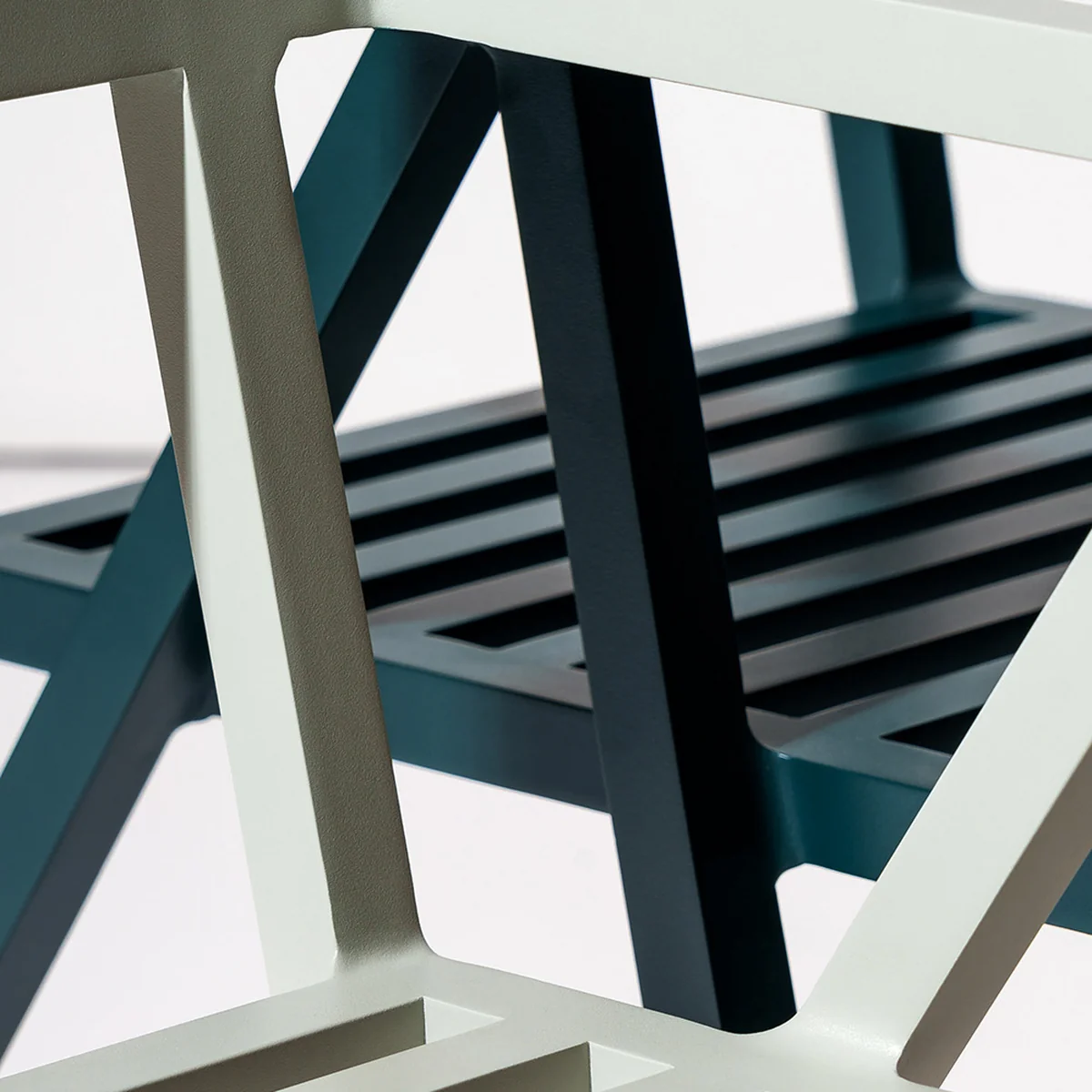 Chaque article de la série dispose d'un design individuel. Le matériau, la couleur et les proportions de l'extrusion d'aluminium uniformisent l'ensemble de la collection. La base de la série '19 Outdoor' est le projet de design '19 Chairs' - 19 chaises ont été fabriquées en 19 jours, livrées à 19 endroits, retravaillées par 19 créatifs et ce pendant la phase COVID-19. Le but était de créer une réaction en faveur de l'Age UK & Resourcing Racial Justice, en ce qui concerne les dommages causés par les restrictions de COVID-19 au sein de la scène artistique.