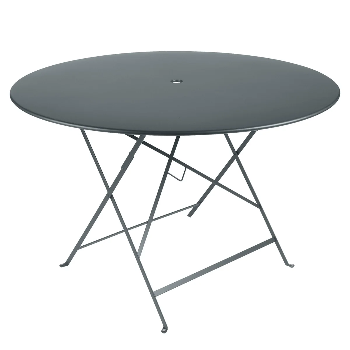 La table est fabriquée à partir d'une structure en acier peint et d'un plateau en tôle d'acier. Le traitement de protection et la peinture en poudre font que la table est faite pour l'extérieur et protège la table des rayons UV. La table de jardin ronde d'un diamètre de 117 cm dispose d'un petit évidement au centre du plateau de table qui sert de support pratique pour le parasol. Les parasols avec une tige de Ø 41 mm maximum peuvent être encastrés dans le plateau de la table.