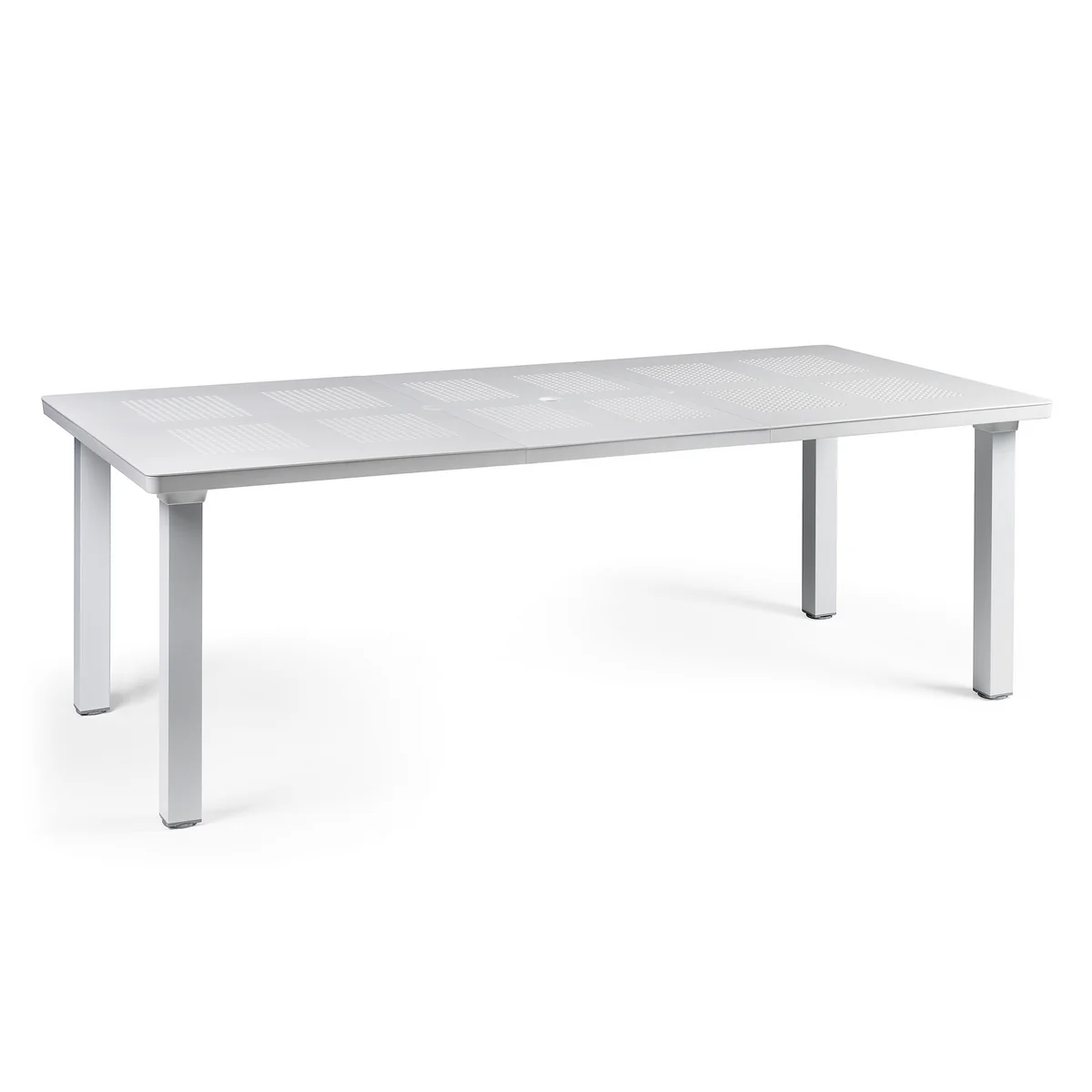 La table extensible Levante de Nardi est une table en polypropylène conçue pour un usage extérieur, dont le design rappelle les meubles de jardin traditionnels en fer. La surface de la table est décorée d'un motif de petits trous qui se répètent en séquence et peut être étendue de 160 cm à 220 cm. Les pieds à section carrée sont ancrés à la surface par un simple système de vis.