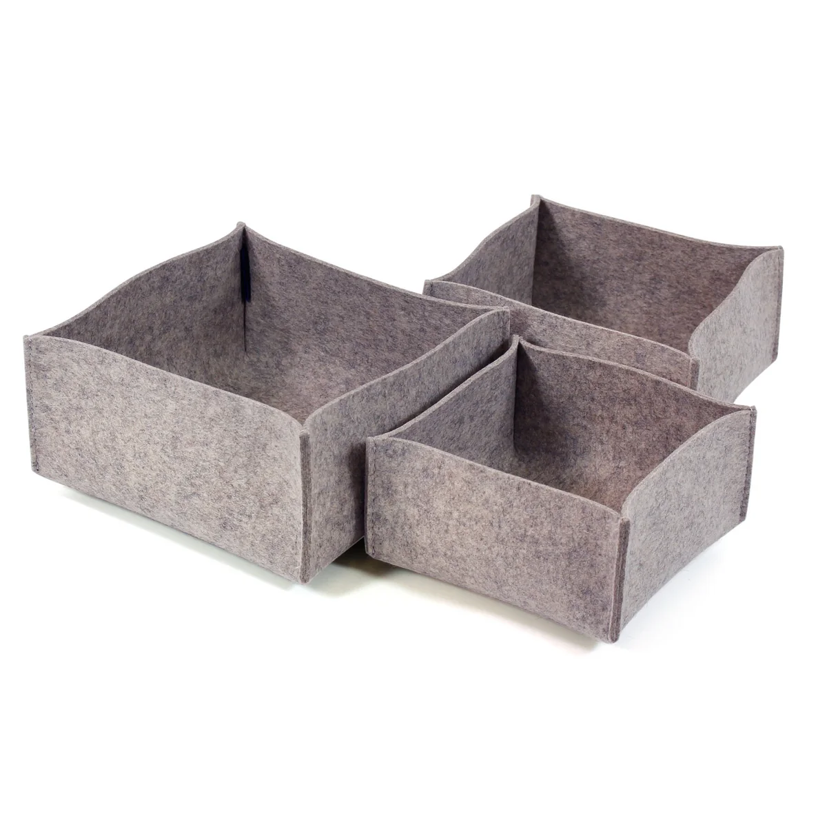 Le lot de boîtes 2 est composé de trois boîtes en feutre de tailles différentes que l'on peut simplement empiler. Boîtes en feutre en guise de rangement pour accessoires ou de corbeilles à pain pratiques pour le petit-déjeuner.