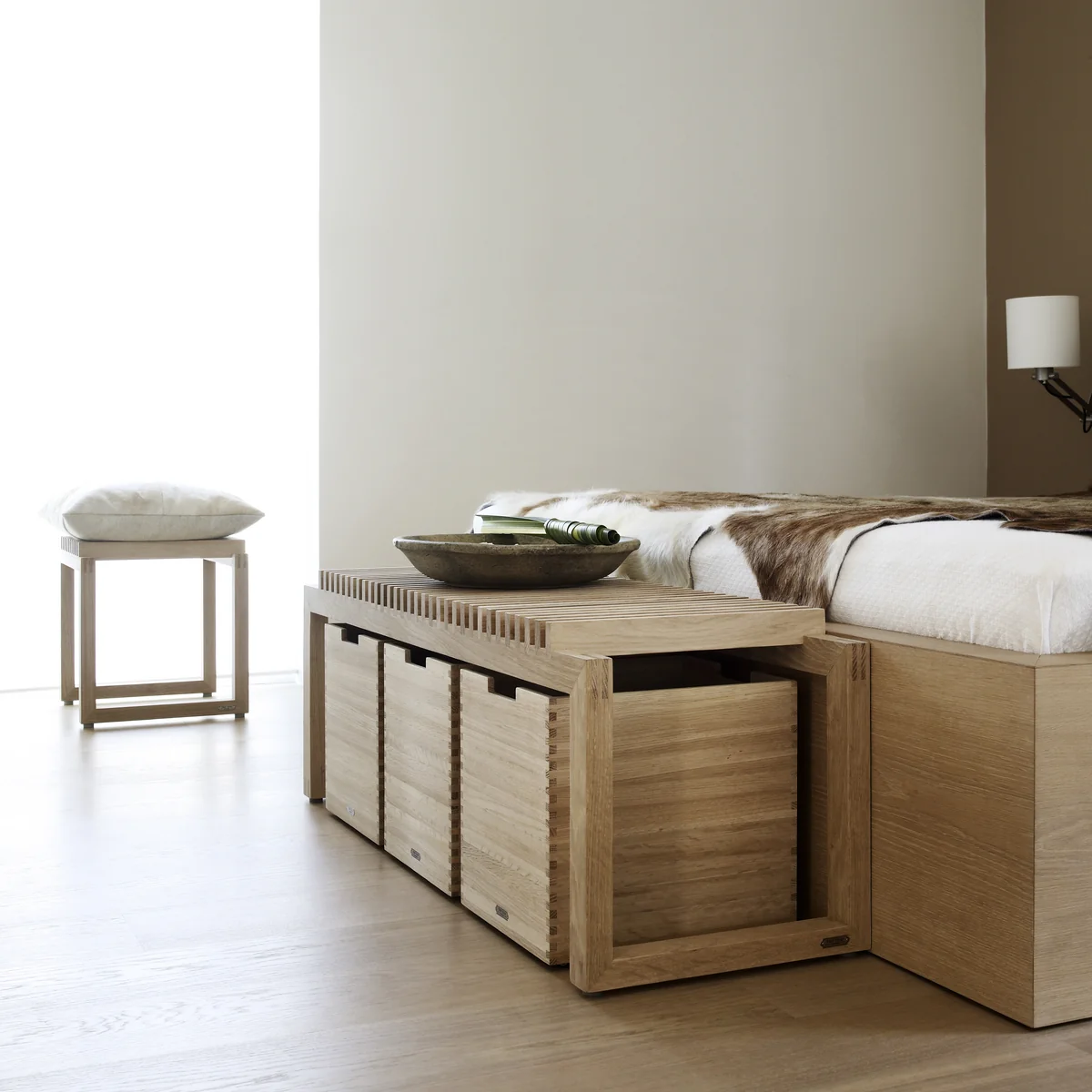 La petite version de la Cutter Box possède des pieds, tandis que la grande version est équipée de roulettes : elles font en sorte que la caisse scandinave soit parfaitement adaptée pour être placée sous le Cutter banc, de la Cutter La caisse peut être rangée dans le coffre d'une chaise ou d'un autre meuble et ressortie en un tour de main.