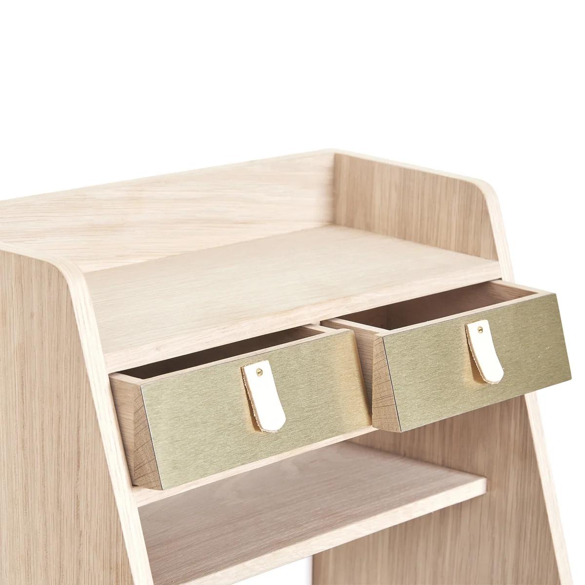 La table Suzon étagère murale de Florence Watine pour Hartô est à la fois une table d'appoint flottante, une étagère pour le vestiaire et une étagère murale. Elle offre beaucoup d'espace de rangement avec ses deux tiroirs et ses trois étagères, tout en étant aussi compacte que possible.