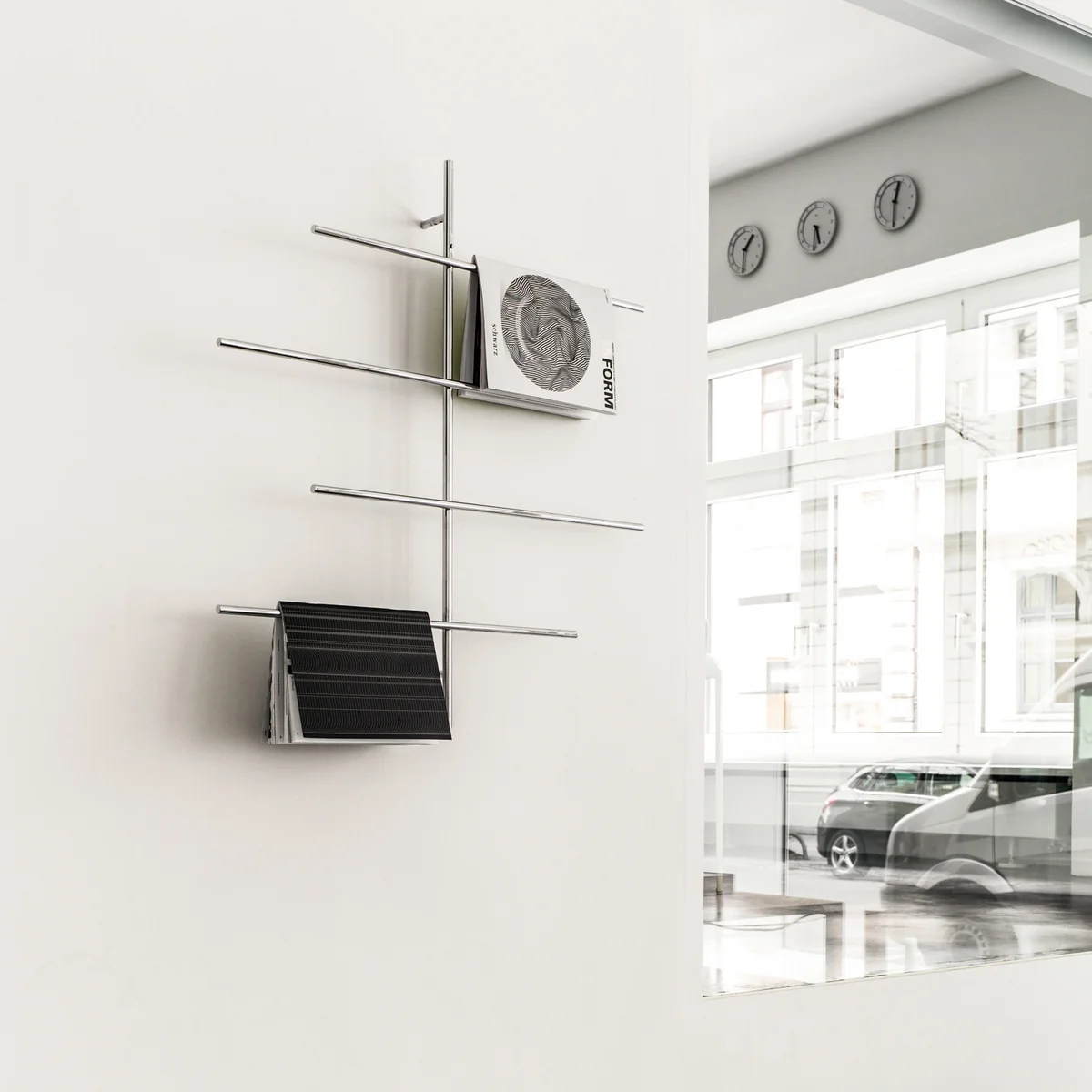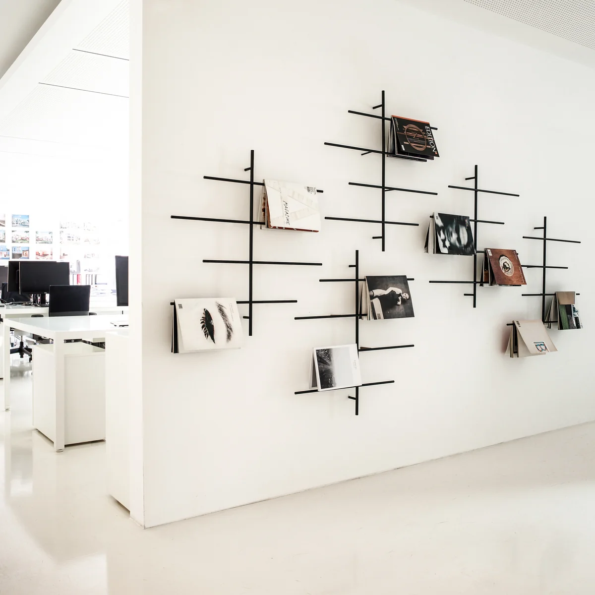 Avec le porte-revues Sketch par Schönbuch, les plus beaux magazines deviendront des éléments décoratifs muraux impressionnants. Le porte-revues se compose d’une tige verticale et quatre barres horizontales organisées de manière décalée. Pour créer une œuvre d’art pariétale, unique, les magazines devront simplement être ouverts dans leur milieu et disposés simplement en ornement sur les tiges.