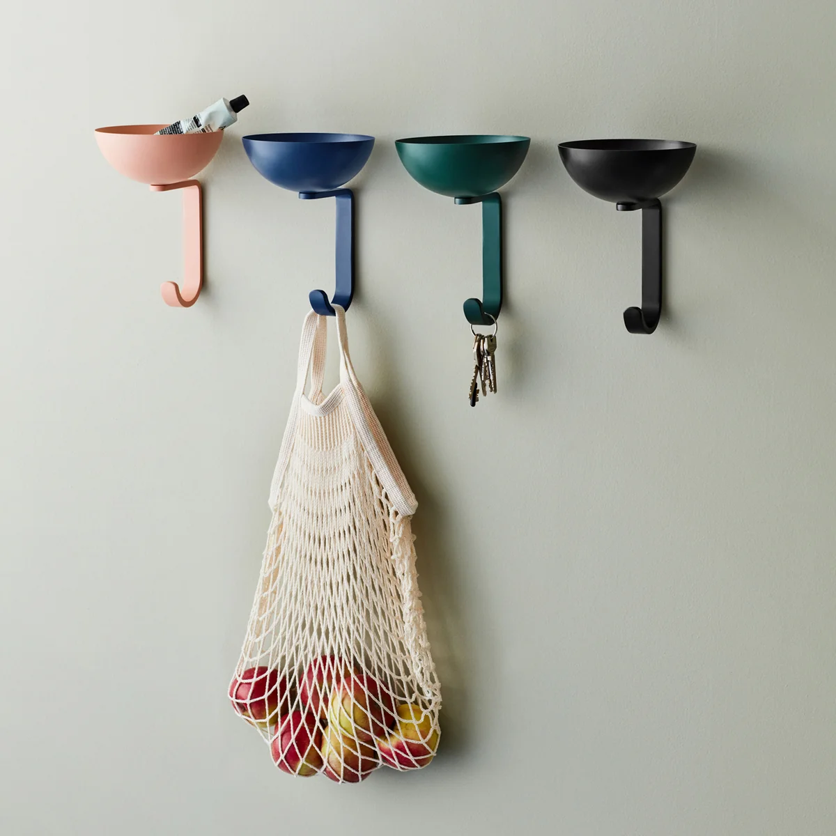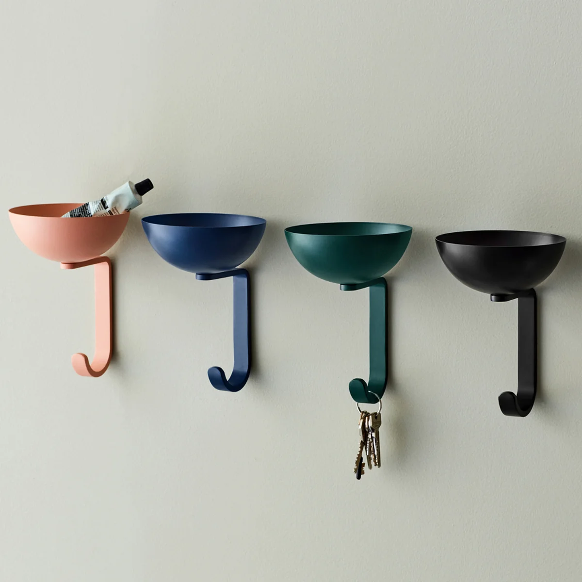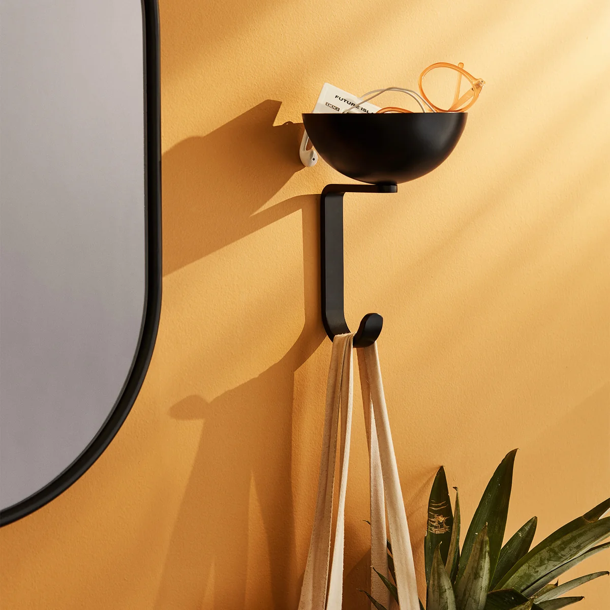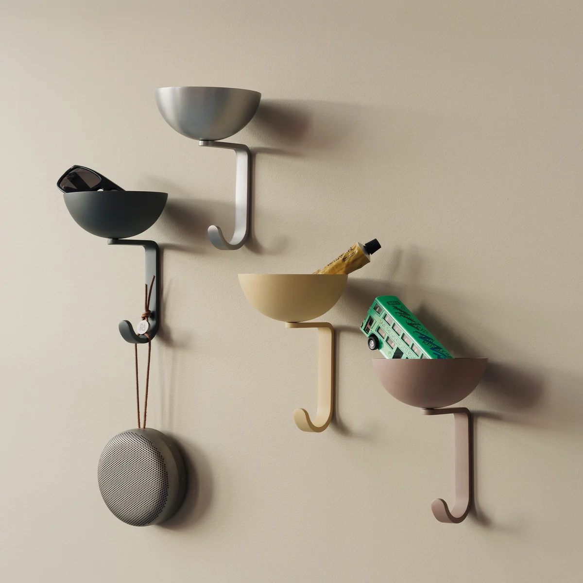 Le crochet mural en acier et aluminium est associé à une coupelle ronde - semblable à un oiseau - qui permet de suspendre des objets. nest - qui permet de ranger toutes sortes d'objets en toute sécurité.