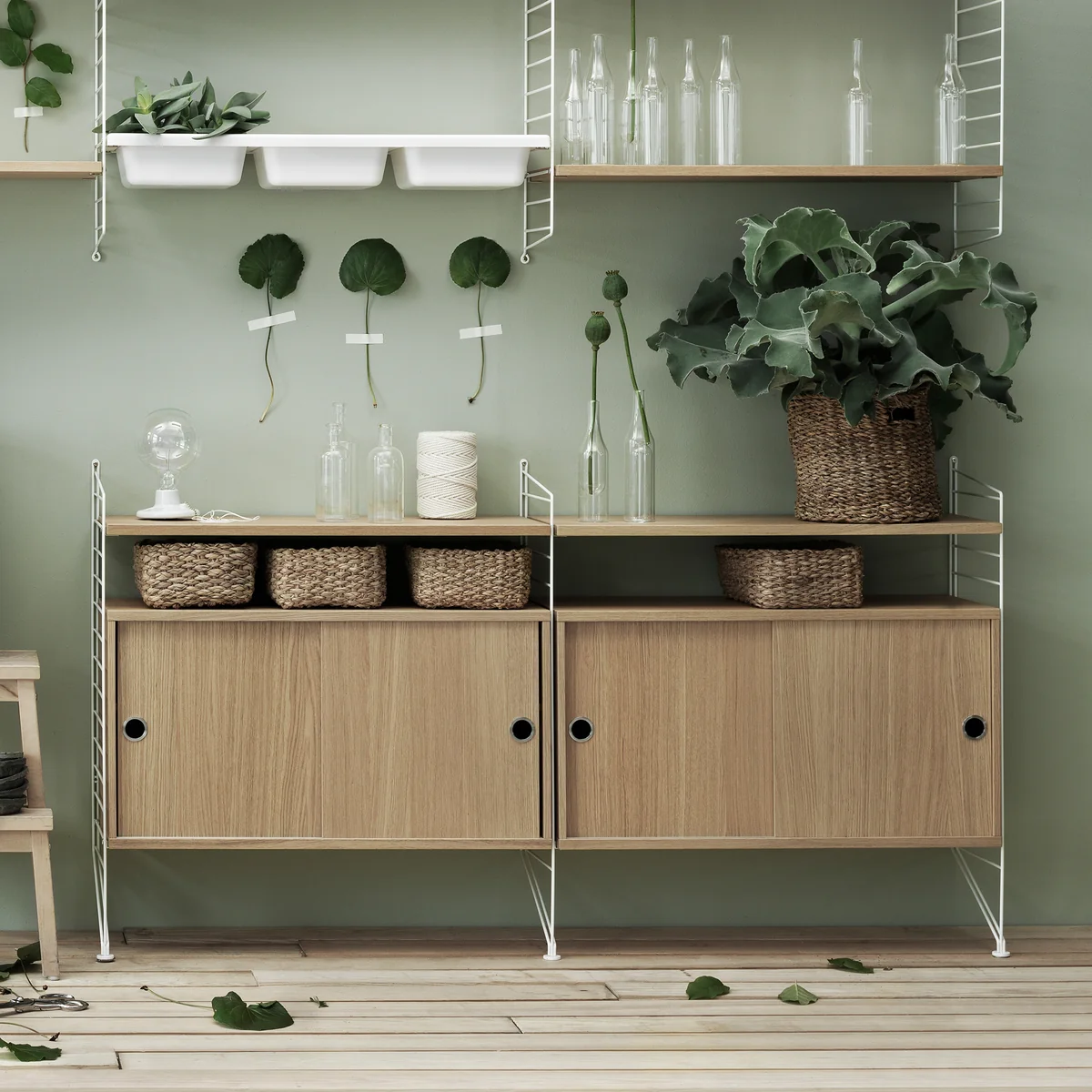 Le module d'armoire à portes coulissantes de String permet de transformer le système d'étagères en une armoire organisée et les objets qui ne doivent pas être immédiatement visibles peuvent disparaître discrètement derrière les portes coulissantes du module. Chaussures, jouets, dossiers, verres, livres et bien d'autres choses encore peuvent être dissimulés facilement et avec style dans l'armoire coulissante de String, à l'abri du regard des autres.