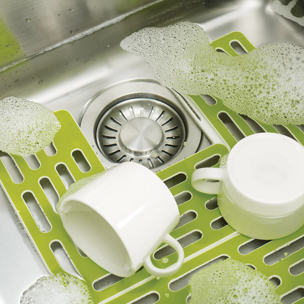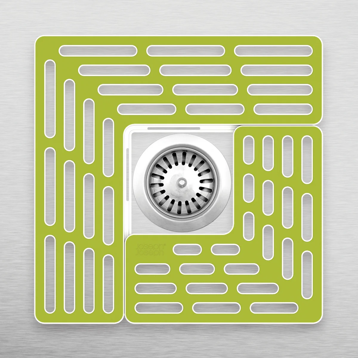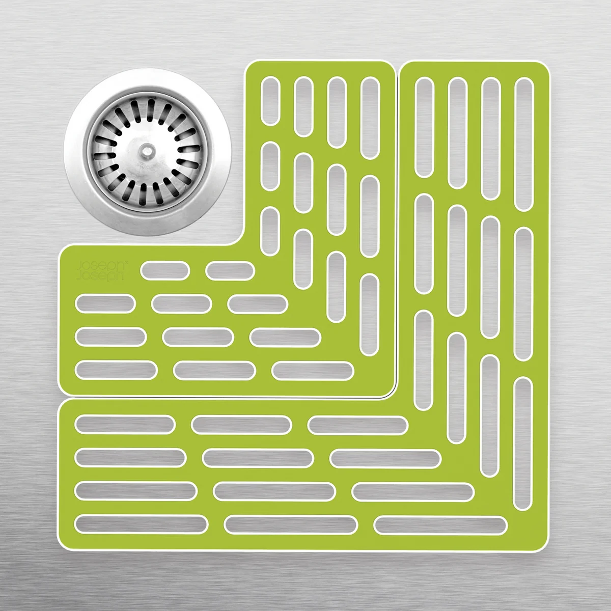 Laver la vaisselle à la main ou poser des éléments en verre ou en porcelaine de haute qualité dans l'évier devient plus sûrs avec l'utilisation du protecteur d'évier SinkSaver. Avec ses pieds antidérapants, le tapis de Joseph Joseph ne glisse pas et permet également à l'eau de s'écouler correctement et à l'air de circuler sous lui. En outre, les éviers délicats en acier inoxydable ou en céramique sont protégés durant le lavage.