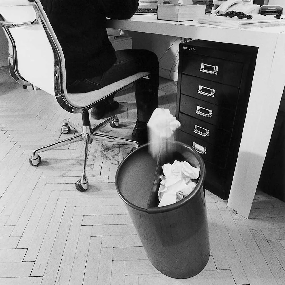 La corbeille à papier penchée „In Attesa“ est l’un des classiques du design d’Enzo Mari et un excellent objet d’usage courant intemporel qui ne devrait manquer dans aucun bureau orienté design.