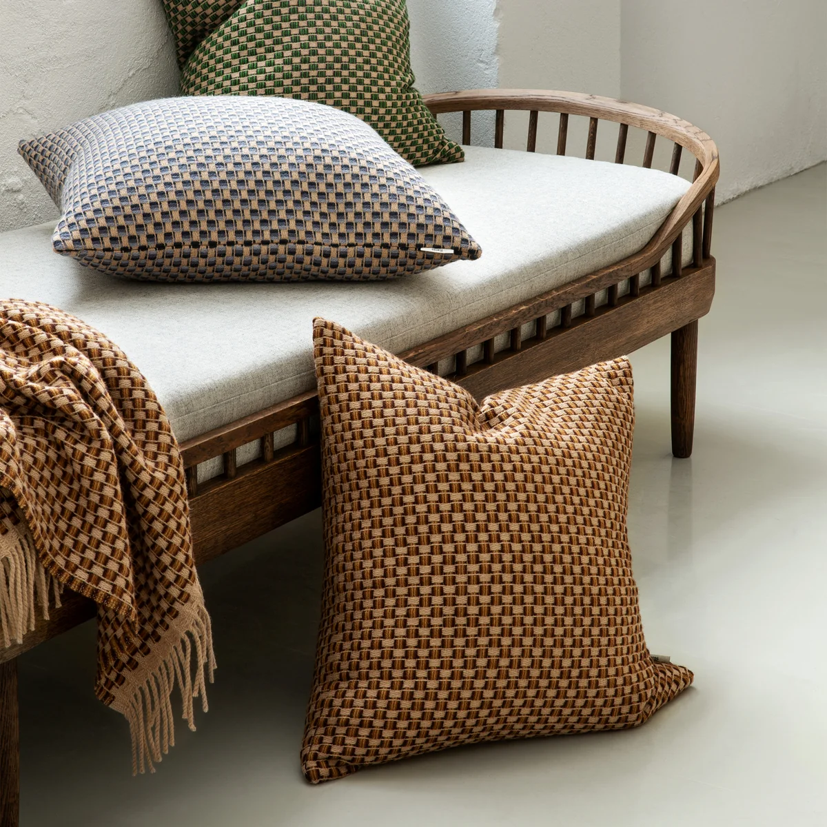 Le tapis Isak coussin du fabricant norvégien Røros Tweed rappelle, avec son aspect tressé, les sièges des chaises classiques Shaker. Le motif du Isak coussin des designers Anderssen & Voll a été créé en 2016 et faisait partie du projet de recherche "Furnishing Uptopia". L'atelier s'est déroulé dans le Hancock Shaker Village aux États-Unis, qui a servi de source d'inspiration avec ses chaises Shaker emblématiques. L'objectif du studio de design était de transposer l'aspect des bandes de coton tissées multicolores des chaises classiques dans un coussin décoratif. Disponible également en tant que couverture en laine .