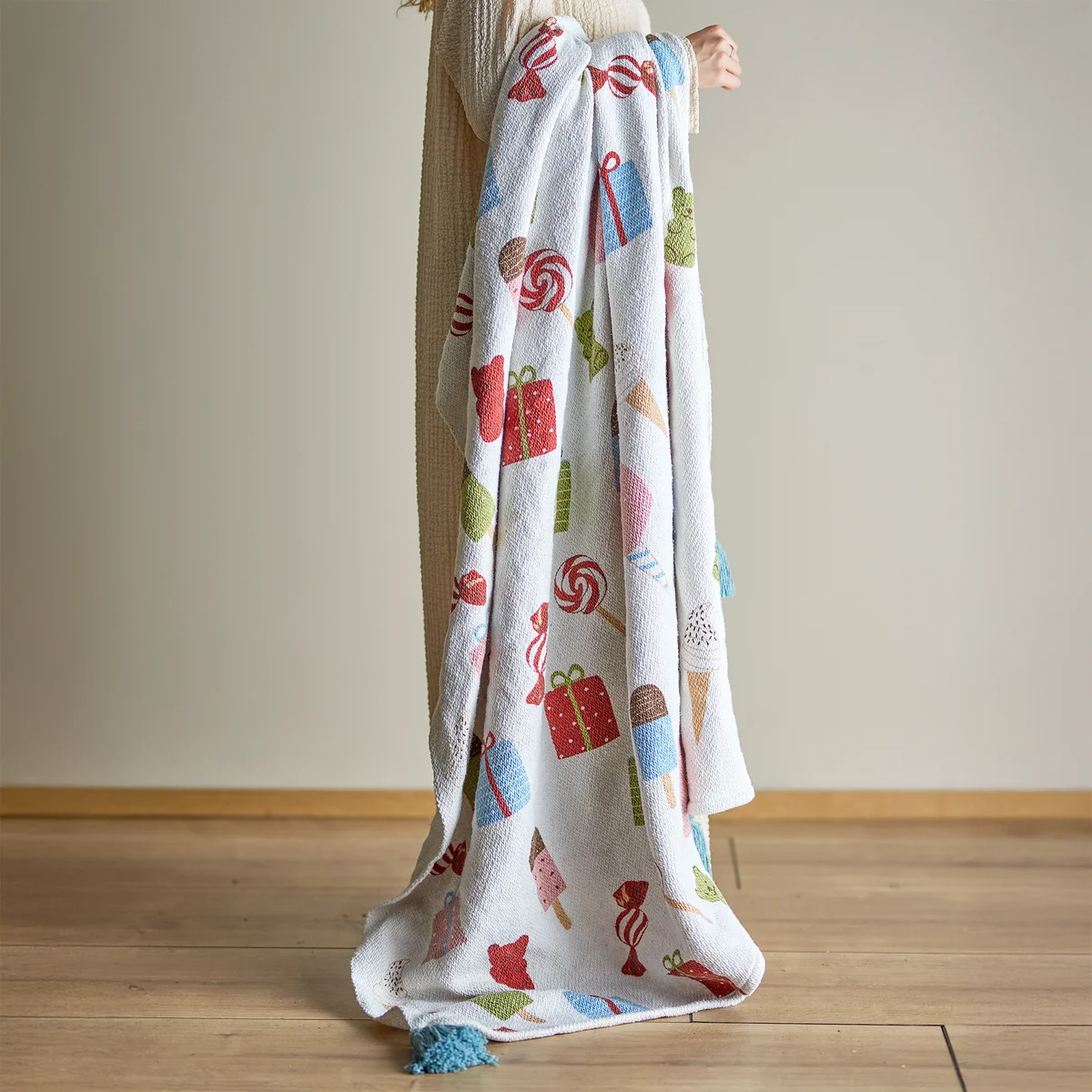 Le Sweets couverture de Bloomingville Mini est un point de mire festif dans la chambre d'enfant. Fabriquée à partir de coton recyclé, cette couverture douillette allie un confort durable à un design ludique qui fera battre le cœur des enfants. Des illustrations de cadeaux, de friandises et de glaces conçues avec amour créent une ambiance estivale et invitent à des aventures imaginatives. Des glands décoratifs à chaque coin confèrent à la couverture une touche de charme supplémentaire et complètent l'image joyeuse de l'ensemble. Qu'il s'agisse d'une couverture douillette et chaleureuse ou d'un élément décoratif plein d'ambiance - la couverture est idéale pour les enfants. Sweets La couverture crée une atmosphère joyeuse et accueillante dans chaque chambre d'enfant.